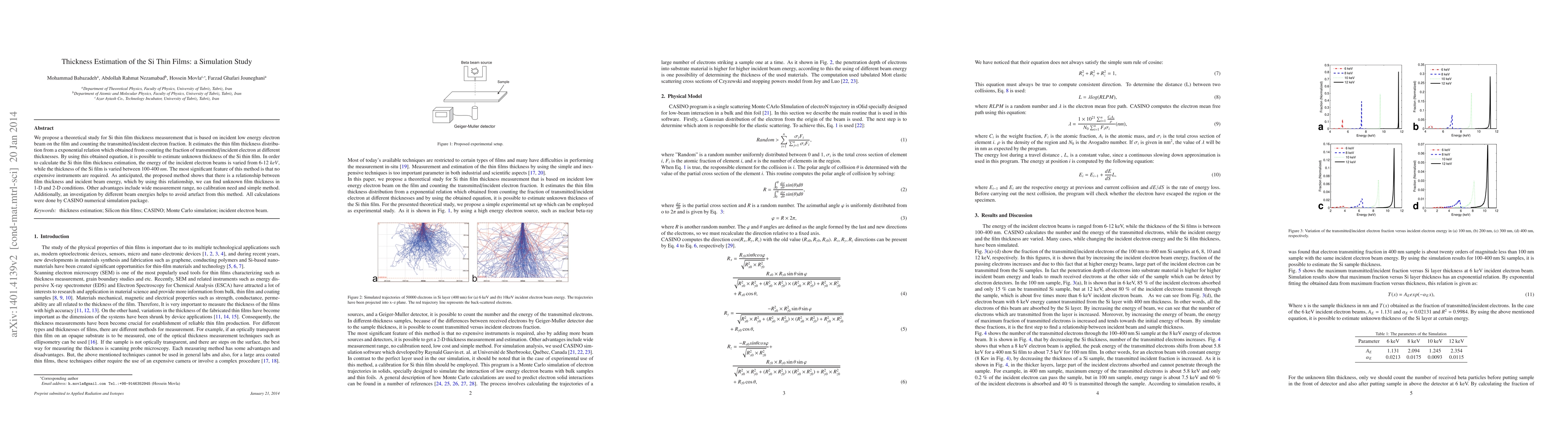We propose a theoretical study for Si thin film thickness measurement that is based on incident low energy electron beam on the film and counting the transmitted/incident electron fraction. It estimates the thin film thickness distribution from a exponential relation which obtained from counting the fraction of transmitted/incident electron at different thicknesses. By using this obtained equation, it is possible to estimate unknown thickness of the Si thin film. In order to calculate the Si thin film thickness estimation, the energy of the incident electron beams is varied from 6-12 keV, while the thickness of the Si film is varied between 100-400 nm. The most significant feature of this method is that no expensive instruments are required. As anticipated, the proposed method shows that there is a relationship between film thickness and incident beam energy, which by using this relationship, we can find unknown film thickness in 1-D and 2-D conditions. Other advantages include wide measurement range, no calibration need and simple method. Additionally, an investigation by different beam energies helps to avoid artefact from this method. All calculations were done by CASINO numerical simulation package.