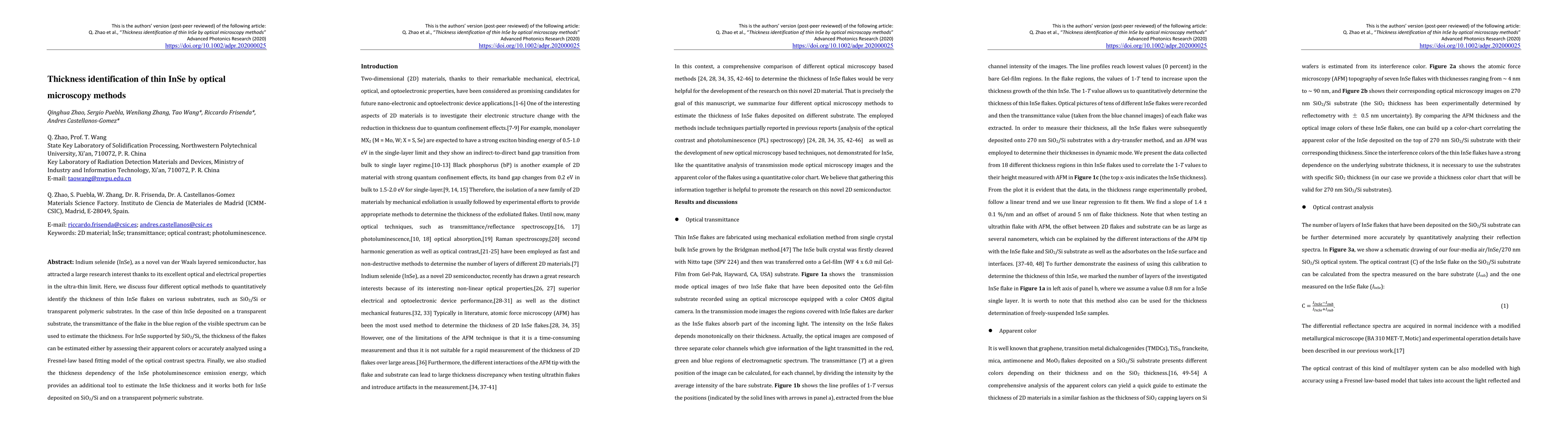 This paper explores four optical methods to determine the thickness of thin InSe flakes, including transmittance analysis for transparent substrates and color assessment, Fresnel-law fitting, and photoluminescence emission energy analysis for SiO2/Si substrates. These techniques provide reliable means to quantify InSe thickness across different substrates.