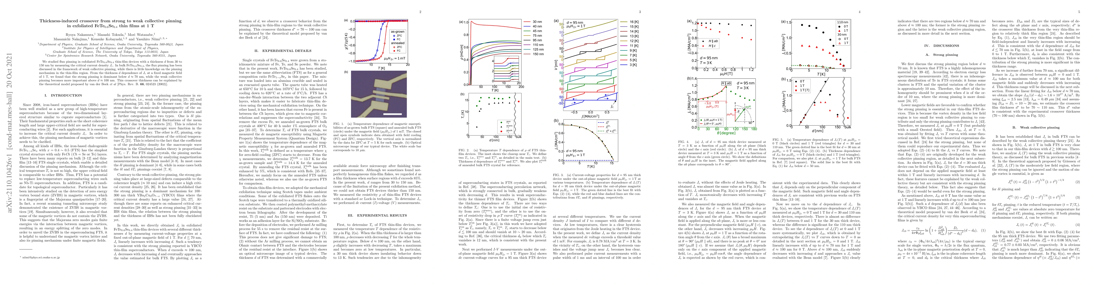 This study investigates the transition from strong to weak collective flux pinning in exfoliated FeTe$_{0.6}$Se$_{0.4}$ thin films as film thickness varies from 30 to 150 nm. The critical current density $J_{\mathrm{c}}$ reveals a dominant strong pinning below 70 nm and a shift to weak collective pinning above 100 nm, explained by a theoretical model.