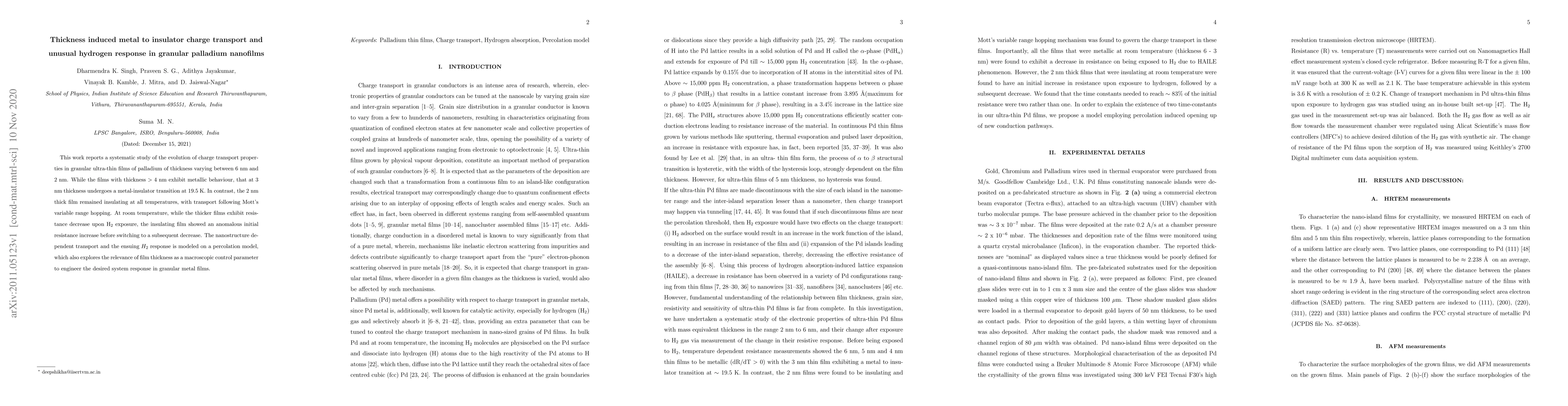 This study investigates charge transport in ultra-thin palladium films, revealing a metal-insulator transition at 3nm thickness and unusual hydrogen response, with a 2nm film remaining insulating and exhibiting an initial resistance increase upon H$_2$ exposure. The findings suggest film thickness as a key parameter for engineering granular metal film responses.