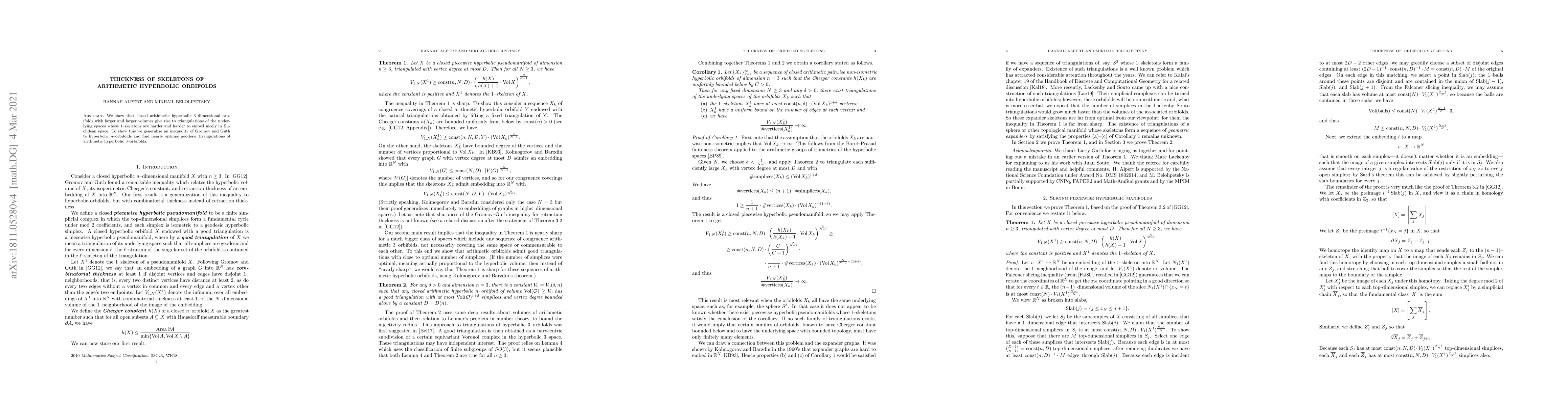 This paper demonstrates that higher-volume closed arithmetic hyperbolic n-orbifolds result in increasingly complex 1-skeletons that are harder to embed in Euclidean space. The authors achieve this by generalizing a Gromov-Guth inequality and discovering nearly optimal geodesic triangulations for these orbifolds.