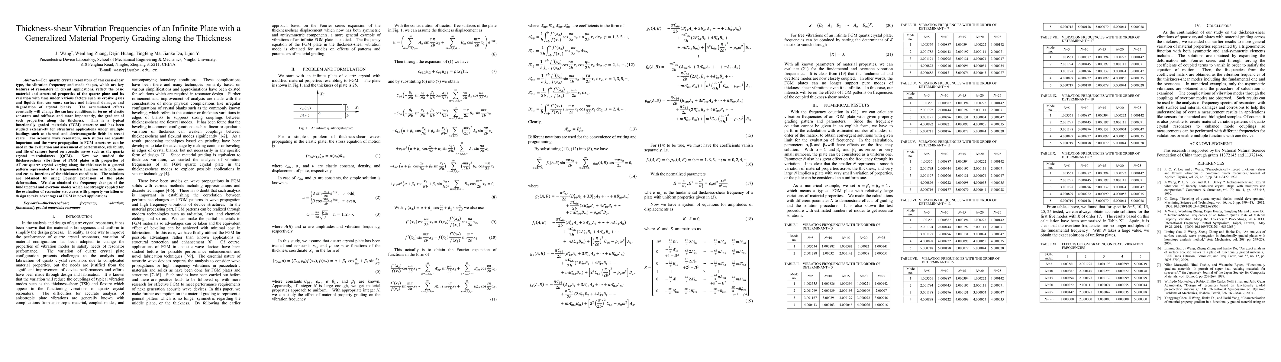 For quartz crystal resonators of thickness-shear type, the vibration frequency and mode shapes, which are key features of resonators in circuit applications, reflect the basic material and structural properties of the quartz plate and its variation with time under various factors such as erosive gases and liquids that can cause surface and internal damages and degradation of crystal blanks. The accumulated effects eventually will change the surface conditions in terms of elastic constants and stiffness and more importantly, the gradient of such properties along the thickness. This is a typical functionally graded materials (FGM) structure and has been studied extensively for structural applications under multiple loadings such as thermal and electromagnetic fields in recent years. For acoustic wave resonators, such studies are equally important and the wave propagation in FGM structures can be used in the evaluation and assessment of performance, reliability, and life of sensors based on acoustic waves such as the quartz crystal microbalances (QCM). Now we studied the thickness-shear vibrations of FGM plates with properties of AT-cut quartz crystal varying along the thickness in a general pattern represented by a trigonometric function with both sine and cosine functions of the thickness coordinate. The solutions are obtained by using Fourier expansion of the plate deformation. We also obtained the frequency changes of the fundamental and overtone modes which are strongly coupled for the evaluation of resonator structures with property variation or design to take advantages of FGM in novel applications.
