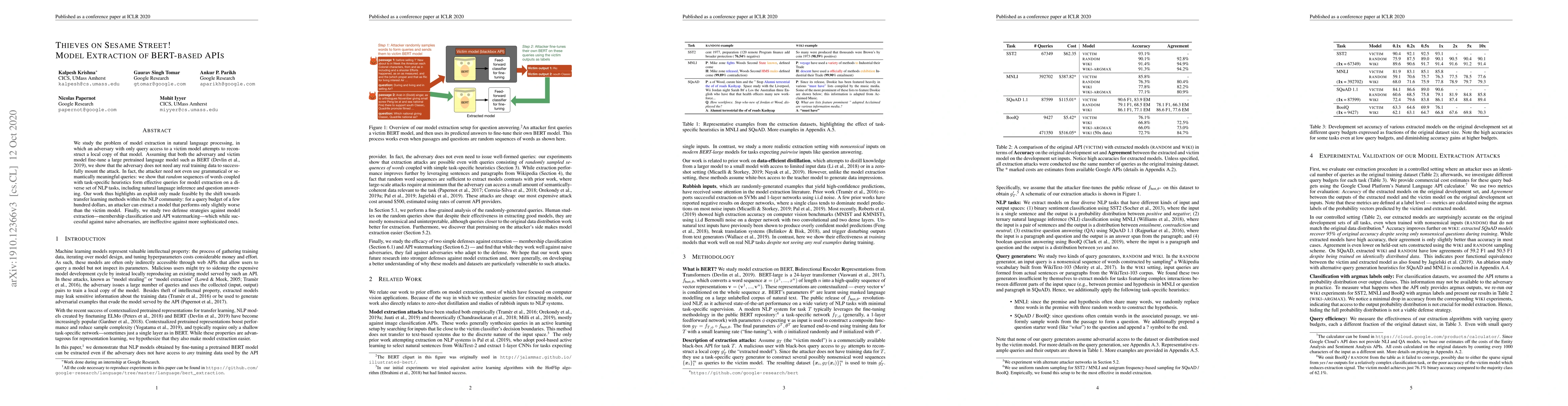 This paper investigates model extraction attacks on BERT-based APIs, demonstrating that adversaries can reconstruct a local copy of the victim model using only query access without needing real training data. The study reveals that even random word sequences and task-specific heuristics can effectively extract models, highlighting the risks posed by transfer learning methods. It also examines defenses like membership classification and API watermarking, finding them ineffective against sophisticated attackers.