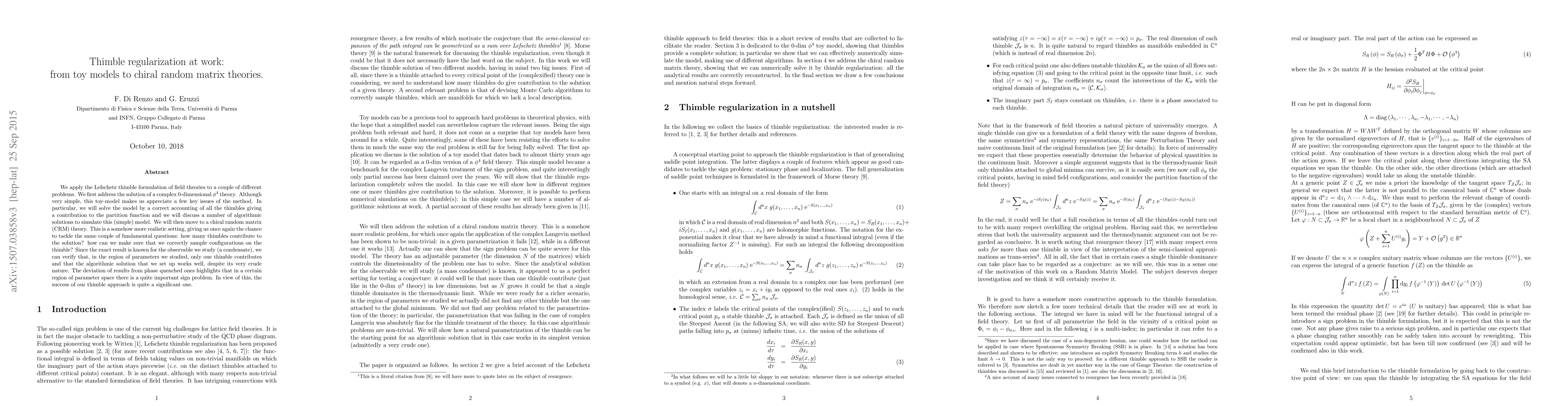 We apply the Lefschetz thimble formulation of field theories to a couple of different problems. We first address the solution of a complex 0-dimensional phi^4 theory. Although very simple, this toy-model makes us appreciate a few key issues of the method. In particular, we will solve the model by a correct accounting of all the thimbles giving a contribution to the partition function and we will discuss a number of algorithmic solutions to simulate this (simple) model. We will then move to a chiral random matrix (CRM) theory. This is a somehow more realistic setting, giving us once again the chance to tackle the same couple of fundamental questions: how many thimbles contribute to the solution? how can we make sure that we correctly sample configurations on the thimble? Since the exact result is known for the observable we study (a condensate), we can verify that, in the region of parameters we studied, only one thimble contributes and that the algorithmic solution that we set up works well, despite its very crude nature. The deviation of results from phase quenched results highlights that in a certain region of parameter space there is a quite important sign problem. In view of this, the success of our thimble approach is quite a significant one.