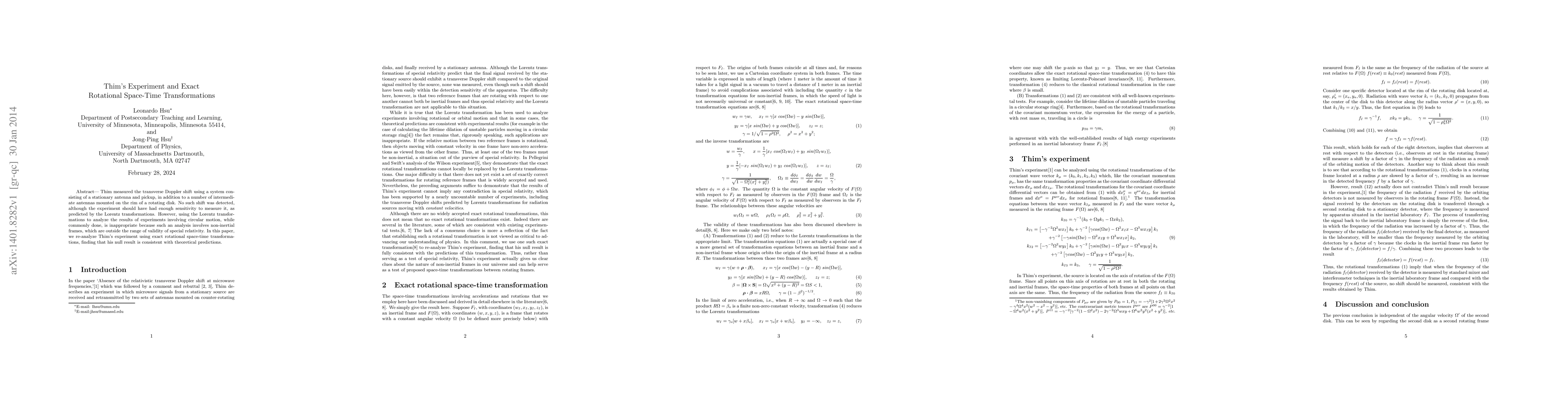 Thim's experiment aimed to measure the transverse Doppler shift using a rotating disk setup, but found no shift despite sufficient sensitivity. The paper re-analyzes Thim's results using exact rotational space-time transformations, confirming that the null result aligns with theoretical predictions when considering non-inertial frame effects.