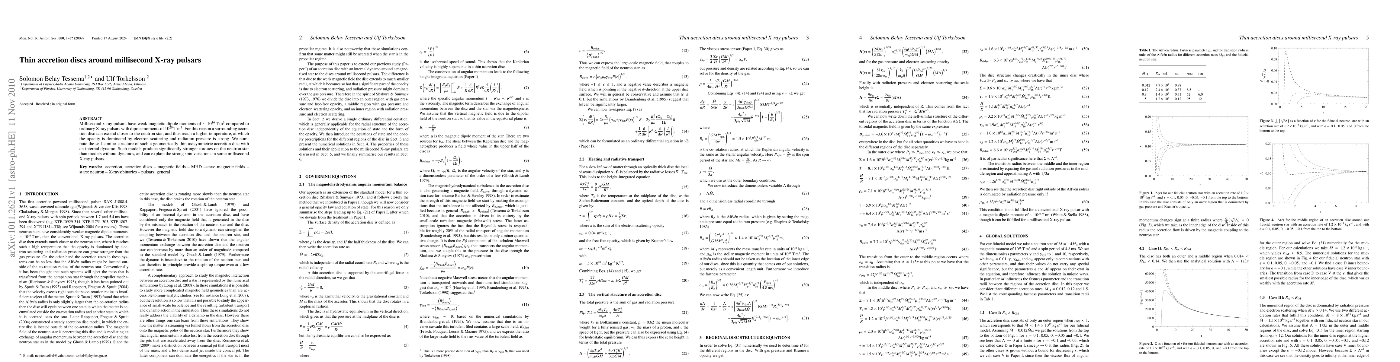 This paper investigates the structure of thin accretion discs around millisecond X-ray pulsars, which have weaker magnetic fields than ordinary pulsars, allowing discs to extend closer and reach higher temperatures. The study computes the self-similar structure of these discs, revealing stronger torques on the neutron star due to internal dynamos, which can explain observed spin variations.