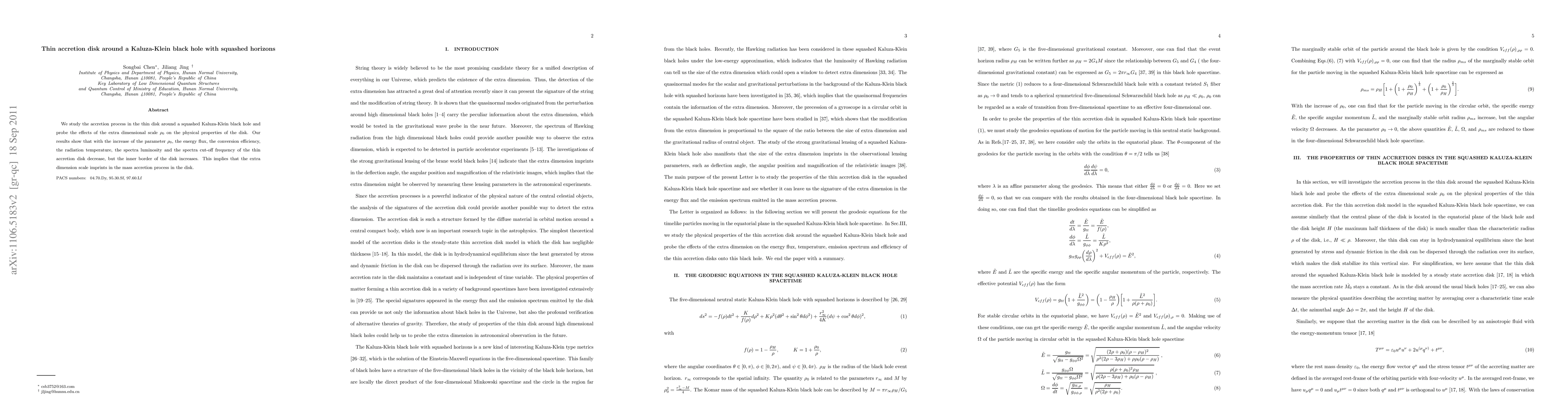 Summary: This study investigates the thin accretion disk around a squashed Kaluza-Klein black hole, revealing that the extra dimensional scale $\rho_0$ decreases the energy flux, efficiency, and radiation temperature of the disk, while increasing its inner border, indicating an influence on the mass accretion process.
