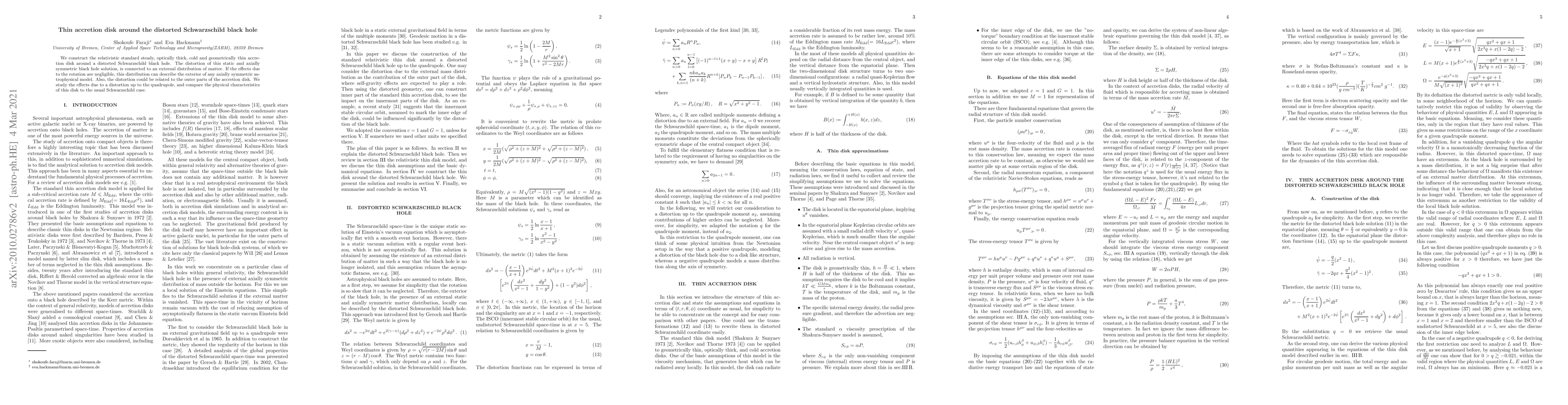 This paper constructs a relativistic accretion disk model around a distorted Schwarzschild black hole, considering the disk's standard, optically thick, and geometrically thin properties. It examines the effects of the black hole's quadrupole distortion, potentially due to an external matter distribution, and compares the disk's characteristics to those around a non-distorted Schwarzschild black hole.