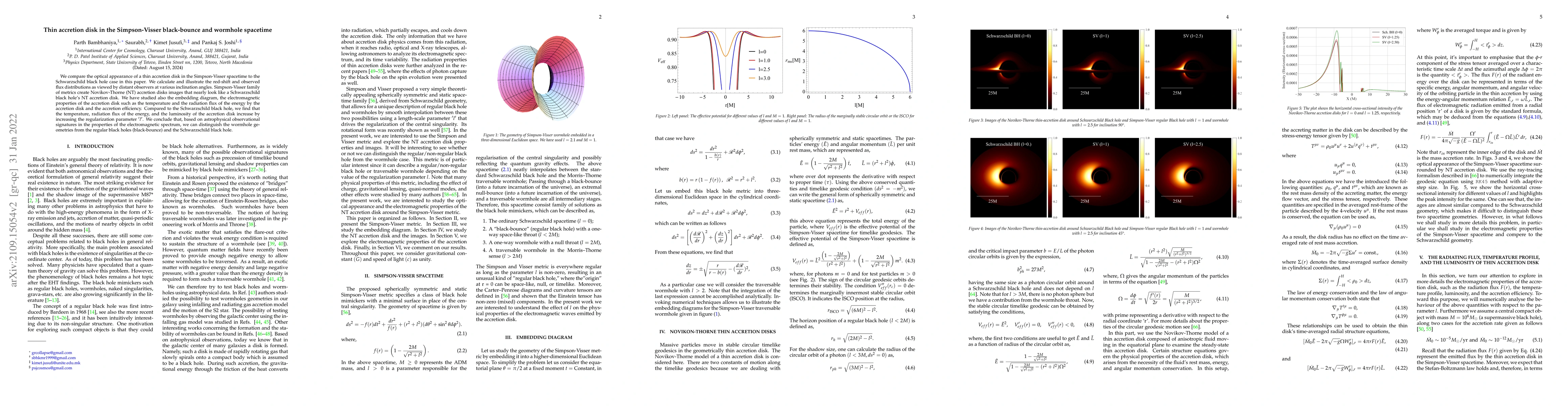 We compare the optical appearance of a thin accretion disk in the Simpson-Visser spacetime to the Schwarzschild black hole case in this paper. We calculate and illustrate the red-shift and observed flux distributions as viewed by distant observers at various inclination angles. Simpson-Visser family of metrics create Novikov-Thorne (NT) accretion disks images that nearly look like a Schwarzschild black hole's NT accretion disk. We have studied also the embedding diagram, the electromagnetic properties of the accretion disk such as the temperature and the radiation flux of the energy by the accretion disk and the accretion efficiency. Compared to the Schwarzschild black hole, we find that the temperature, radiation flux of the energy, and the luminosity of the accretion disk increase by increasing the regularization parameter $'l'$. We conclude that, based on astrophysical observational signatures in the properties of the electromagnetic spectrum, we can distinguish the wormhole geometries from the regular black holes (black-bounce) and the Schwarzschild black hole.