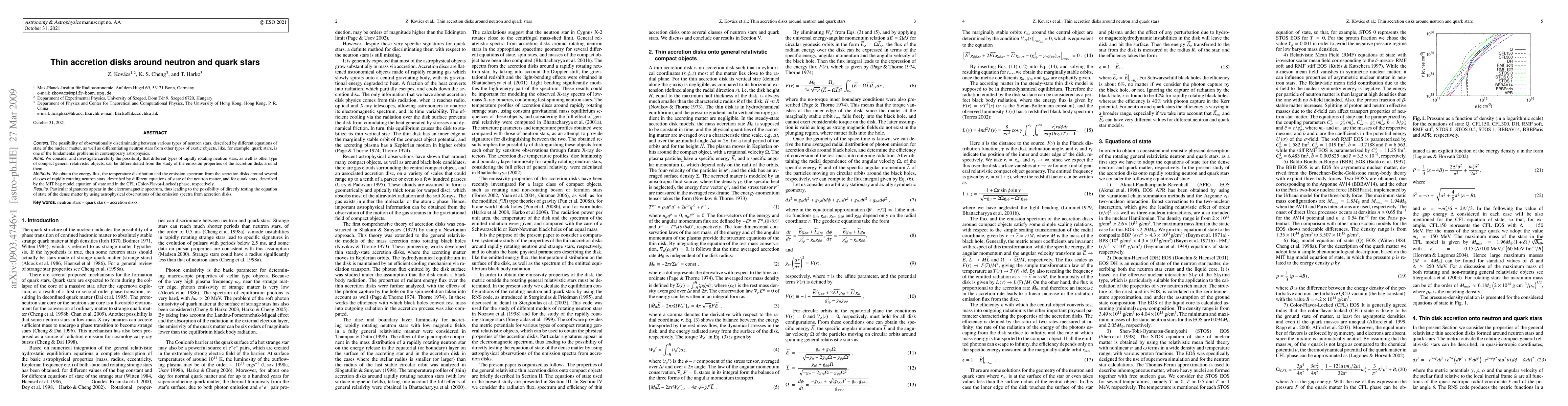 The study investigates the properties of thin accretion disks around rapidly rotating neutron and quark stars using general relativity. It calculates the energy flux, temperature distribution, and emission spectra for various equations of state (EOS) describing neutron matter and quark matter (MIT Bag model and CFL phase).