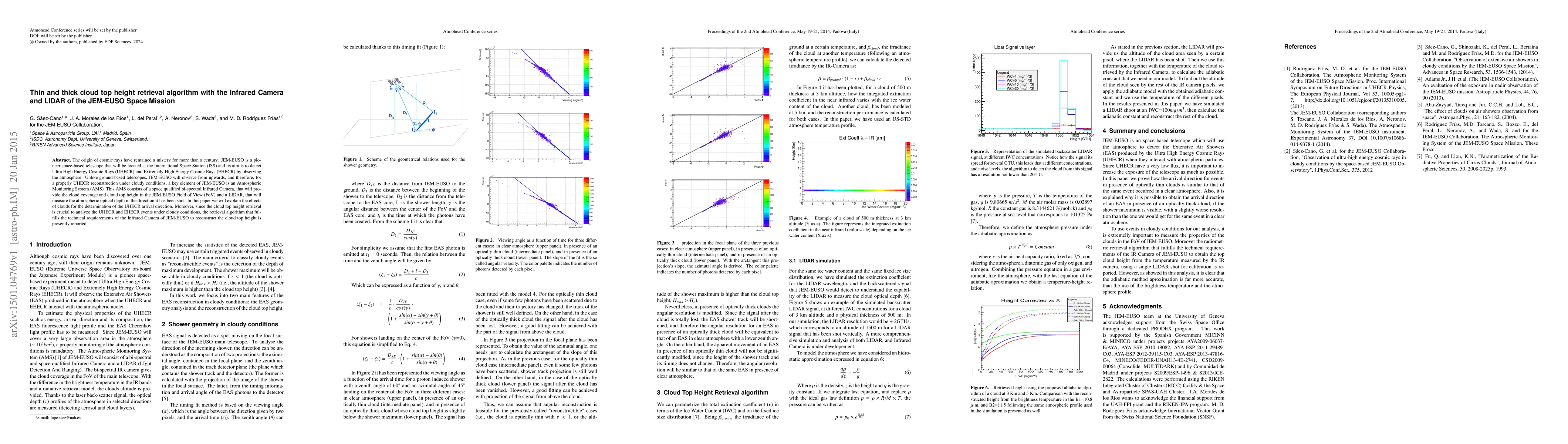 This paper presents an algorithm for retrieving thin and thick cloud top height using the Infrared Camera and LIDAR of the JEM-EUSO space mission, which aims to detect ultra-high energy cosmic rays. The algorithm is crucial for reconstructing cosmic ray arrival directions under cloudy conditions.