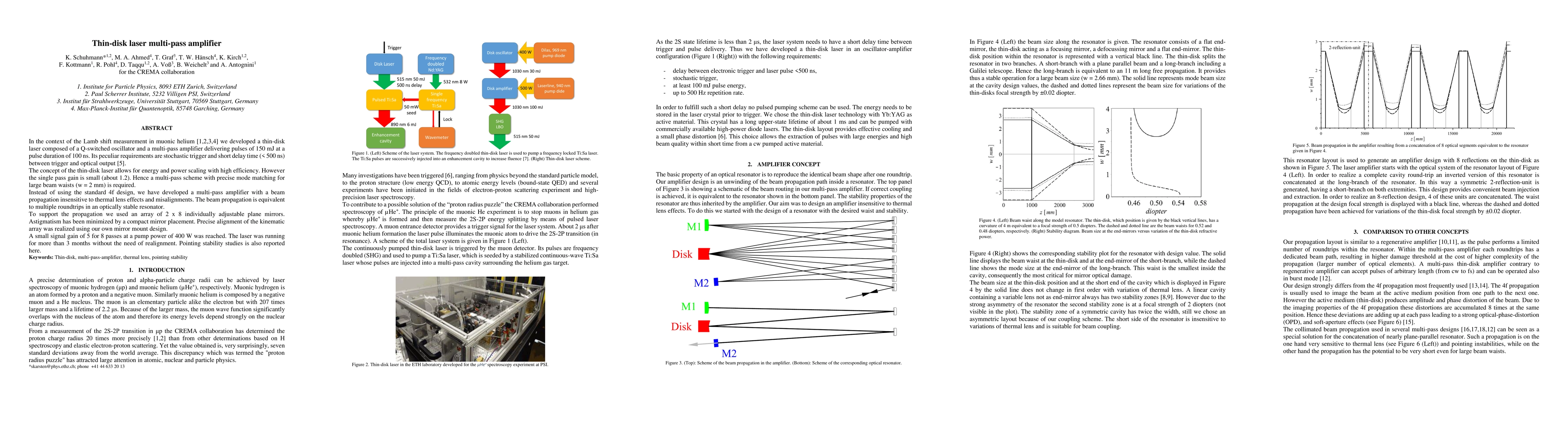 In the context of the Lamb shift measurement in muonic helium we developed a thin-disk laser composed of a Q-switched oscillator and a multi-pass amplifier delivering pulses of 150 mJ at a pulse duration of 100 ns. Its peculiar requirements are stochastic trigger and short delay time (< 500 ns) between trigger and optical output. The concept of the thin-disk laser allows for energy and power scaling with high efficiency. However the single pass gain is small (about 1.2). Hence a multi-pass scheme with precise mode matching for large beam waists (w = 2 mm) is required. Instead of using the standard 4f design, we have developed a multi-pass amplifier with a beam propagation insensitive to thermal lens effects and misalignments. The beam propagation is equivalent to multiple roundtrips in an optically stable resonator. To support the propagation we used an array of 2 x 8 individually adjustable plane mirrors. Astigmatism has been minimized by a compact mirror placement. Precise alignment of the kinematic array was realized using our own mirror mount design. A small signal gain of 5 for 8 passes at a pump power of 400 W was reached. The laser was running for more than 3 months without the need of realignment. Pointing stability studies is also reported here.