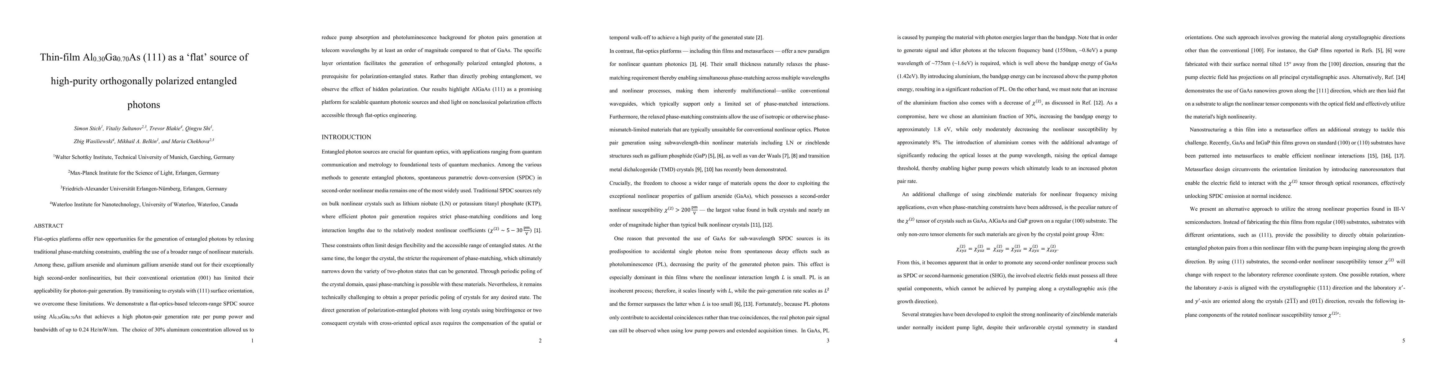 Flat-optics platforms offer new opportunities for the generation of entangled photons by relaxing traditional phase-matching constraints, enabling the use of a broader range of nonlinear materials. Among these, gallium arsenide and aluminum gallium arsenide stand out for their exceptionally high second-order nonlinearities, but their conventional orientation (001) has limited their applicability for photon-pair generation. By transitioning to crystals with (111) surface orientation, we overcome these limitations. We demonstrate a flat-optics-based telecom-range SPDC source using Al0.30Ga0.70As that achieves a high photon-pair generation rate per pump power and bandwidth of up to 0.24 Hz/mW/nm. The choice of 30% aluminum concentration allowed us to reduce pump absorption and photoluminescence background for photon pairs generation at telecom wavelengths by at least an order of magnitude compared to that of GaAs. The specific layer orientation facilitates the generation of orthogonally polarized entangled photons, a prerequisite for polarization-entangled states. Rather than directly probing entanglement, we observe the effect of hidden polarization. Our results highlight AlGaAs (111) as a promising platform for scalable quantum photonic sources and shed light on nonclassical polarization effects accessible through flat-optics engineering.