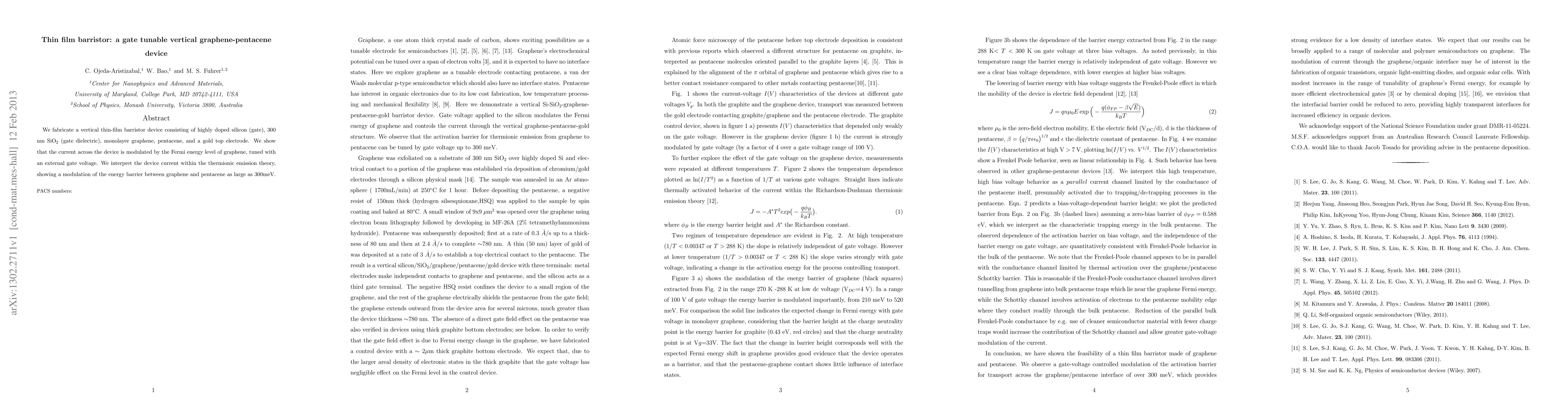 This paper describes a vertical thin-film barristor device using graphene and pentacene, where an external gate voltage modulates the current through thermionic emission by tuning the Fermi energy level of graphene, achieving a significant energy barrier modulation of up to 300 meV.