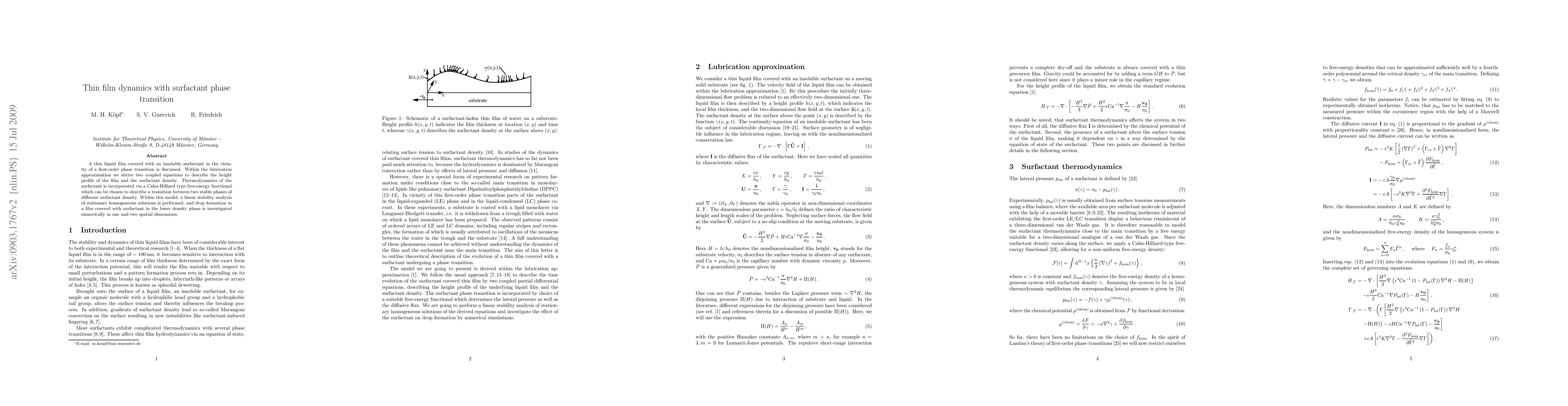 This paper investigates thin liquid films with insoluble surfactants undergoing a first-order phase transition, deriving coupled equations for film height and surfactant density. A Cahn-Hilliard free-energy functional models surfactant thermodynamics, and a linear stability analysis explores drop formation in lower density surfactant phases.