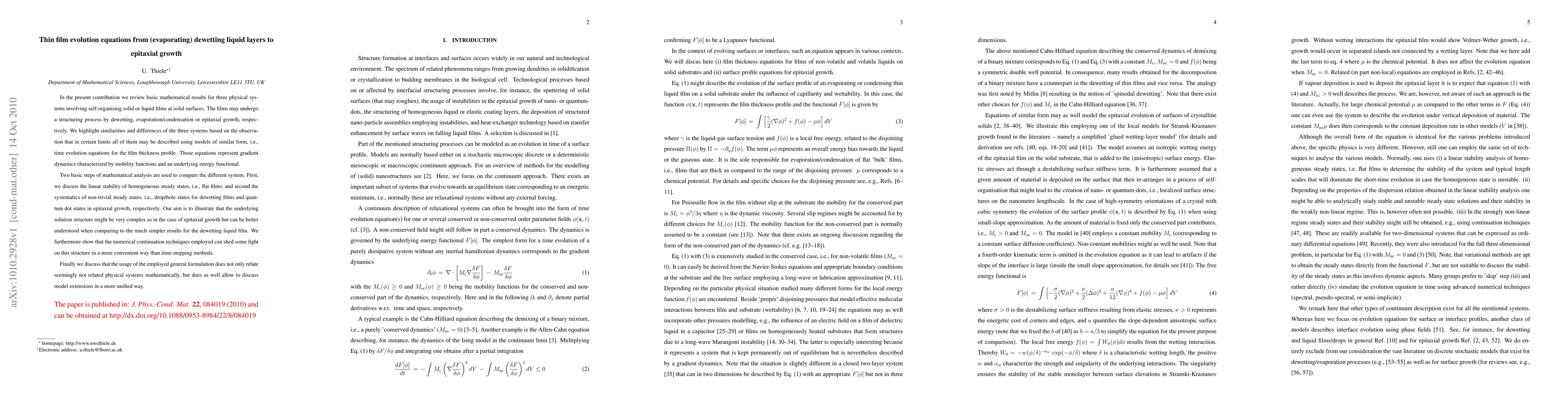 This paper reviews mathematical models for self-organizing films undergoing dewetting, evaporation/condensation, or epitaxial growth, highlighting their similarities and differences. It uses linear stability analysis and systematics of steady states to compare these systems, showing that simpler models can provide insights into more complex epitaxial growth scenarios.