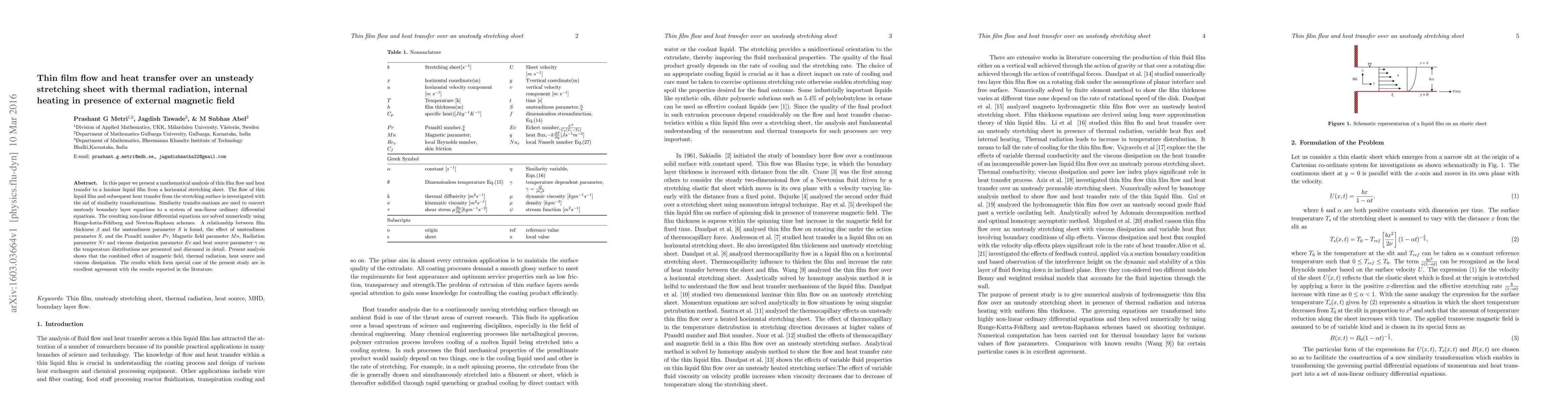 This paper mathematically analyzes thin film flow and heat transfer over an unsteady stretching sheet, incorporating thermal radiation, internal heating, and an external magnetic field. Numerical solutions reveal the effects of various parameters on the temperature distribution and film thickness.