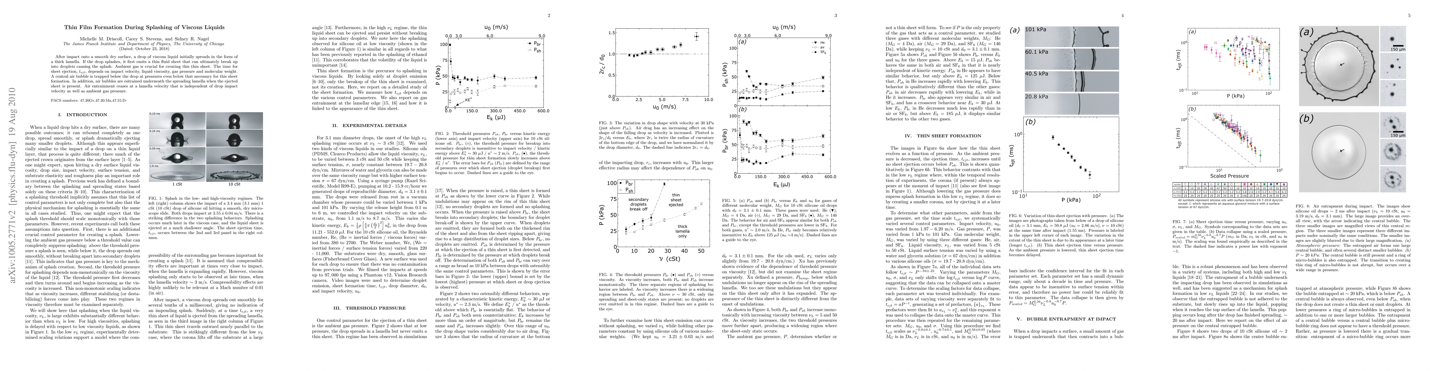 This study investigates the thin film formation and splashing dynamics of viscous liquids upon impact with a dry surface, focusing on the ejection of thin fluid sheets and the role of ambient gas. The time for sheet ejection depends on impact velocity, liquid viscosity, gas pressure, and molecular weight, while air entrainment ceases at a specific lamella velocity regardless of impact conditions.
