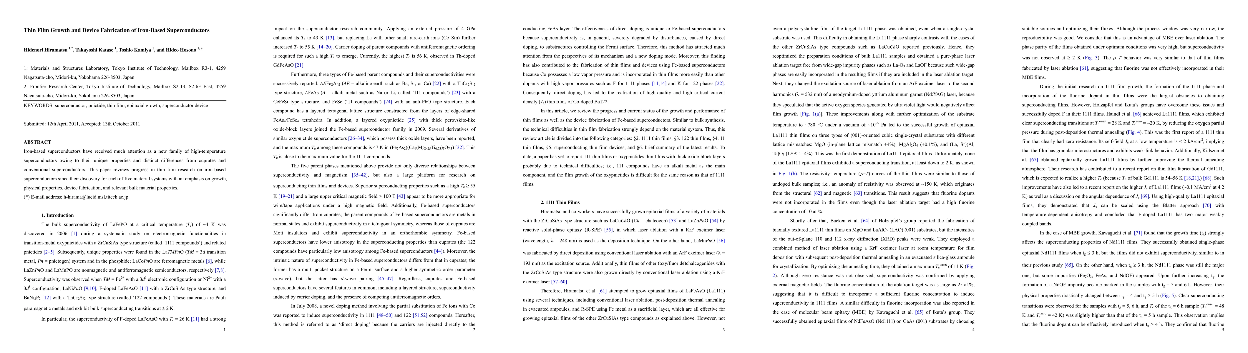 This paper reviews advancements in thin film growth and device fabrication of iron-based superconductors, focusing on five material systems, and highlights their unique properties compared to cuprates and conventional superconductors. It emphasizes growth techniques, physical properties, and device fabrication alongside bulk material characteristics.