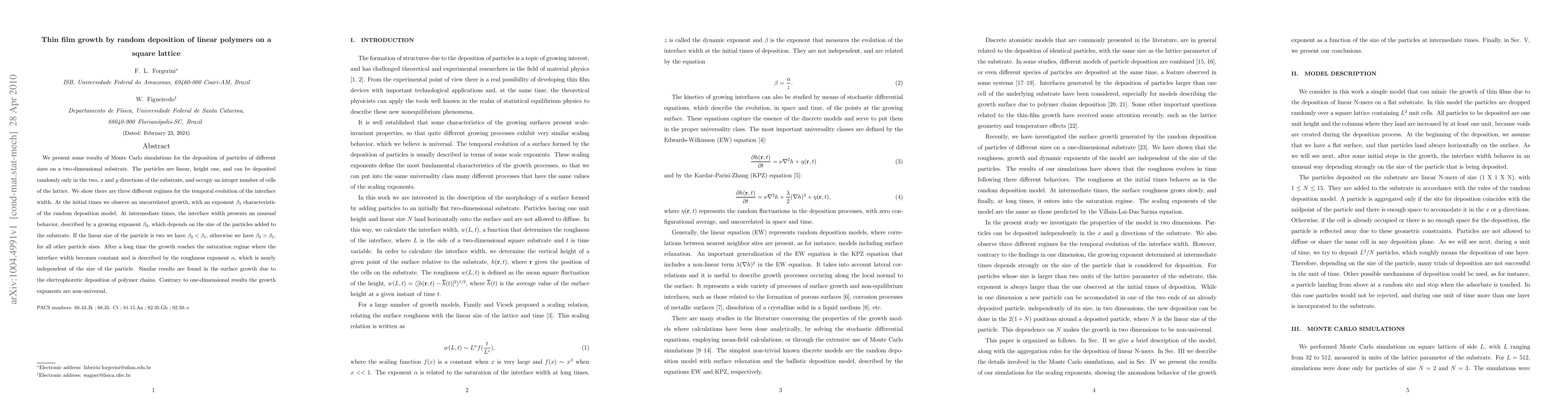 We present some results of Monte Carlo simulations for the deposition of particles of different sizes on a two-dimensional substrate. The particles are linear, height one, and can be deposited randomly only in the two, $x$ and $y$ directions of the substrate, and occupy an integer number of cells of the lattice. We show there are three different regimes for the temporal evolution of the interface width. At the initial times we observe an uncorrelated growth, with an exponent $\beta_{1}$ characteristic of the random deposition model. At intermediate times, the interface width presents an unusual behavior, described by a growing exponent $\beta_{2}$, which depends on the size of the particles added to the substrate. If the linear size of the particle is two we have $\beta_{2}<\beta_{1}$, otherwise we have $\beta_{2}>\beta_{1}$, for all other particle sizes. After a long time the growth reaches the saturation regime where the interface width becomes constant and is described by the roughness exponent $\alpha$, which is nearly independent of the size of the particle. Similar results are found in the surface growth due to the electrophoretic deposition of polymer chains. Contrary to one-dimensional results the growth exponents are non-universal.