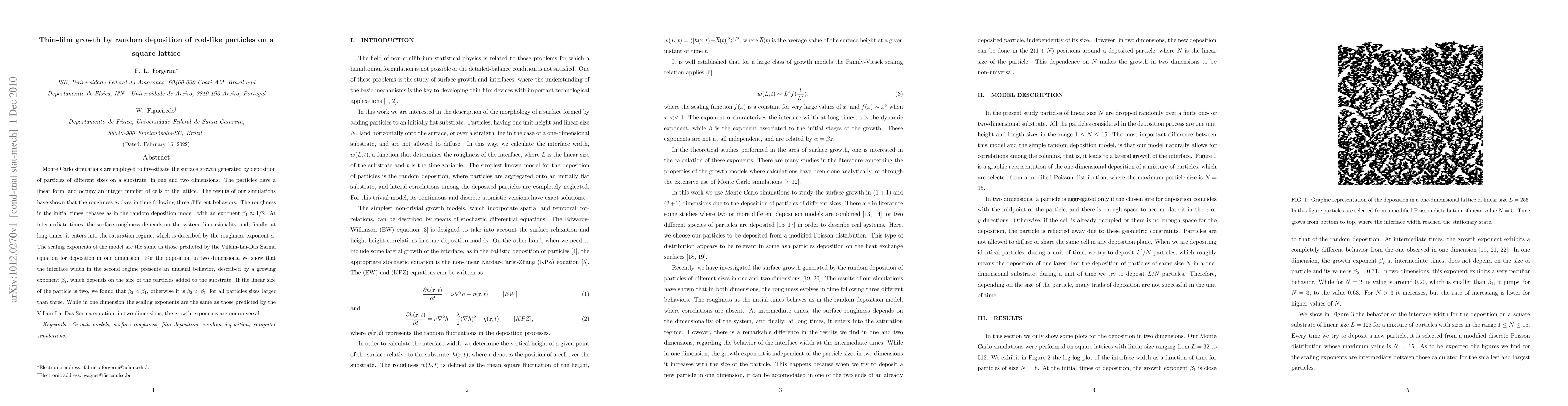 Researchers used Monte Carlo simulations to study surface growth from rod-like particles on a square lattice in 1D and 2D systems, finding that roughness evolves over time with different behaviors and scaling exponents depending on dimensionality.