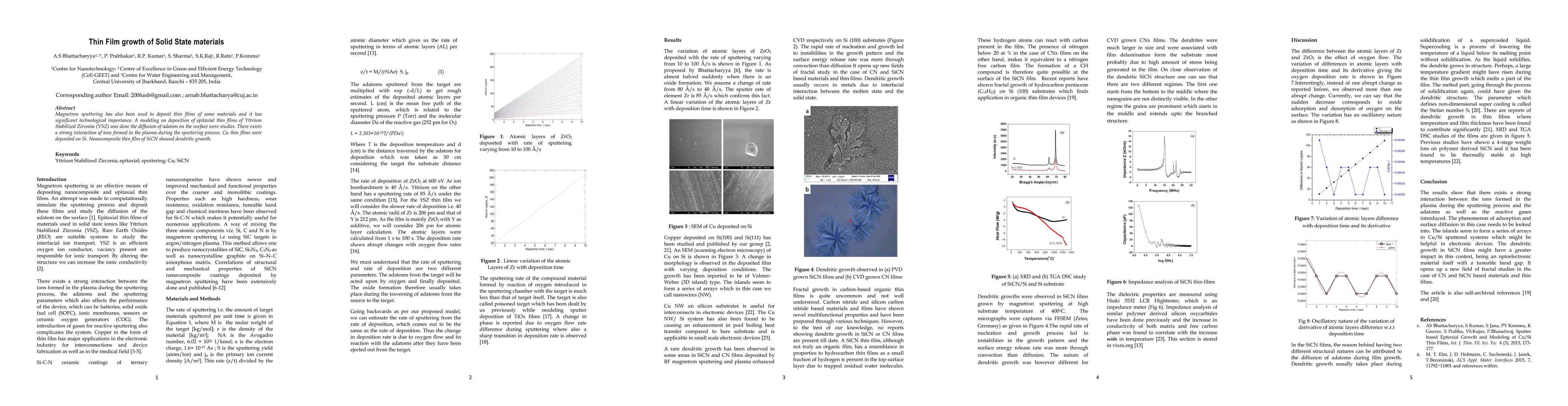 Magnetron sputtering has also been used to deposit thin films of some materials and it has significant technological importance. A modeling on deposition of epitaxial thin films of Yttrium Stabilized Zirconia (YSZ) was done the diffusion of adatom on the surface were studies. There exists a strong interaction of ions formed in the plasma during the sputtering process. Cu thin films were deposited on Si. Nanocomposite thin film of SiCN showed dendritic growth.