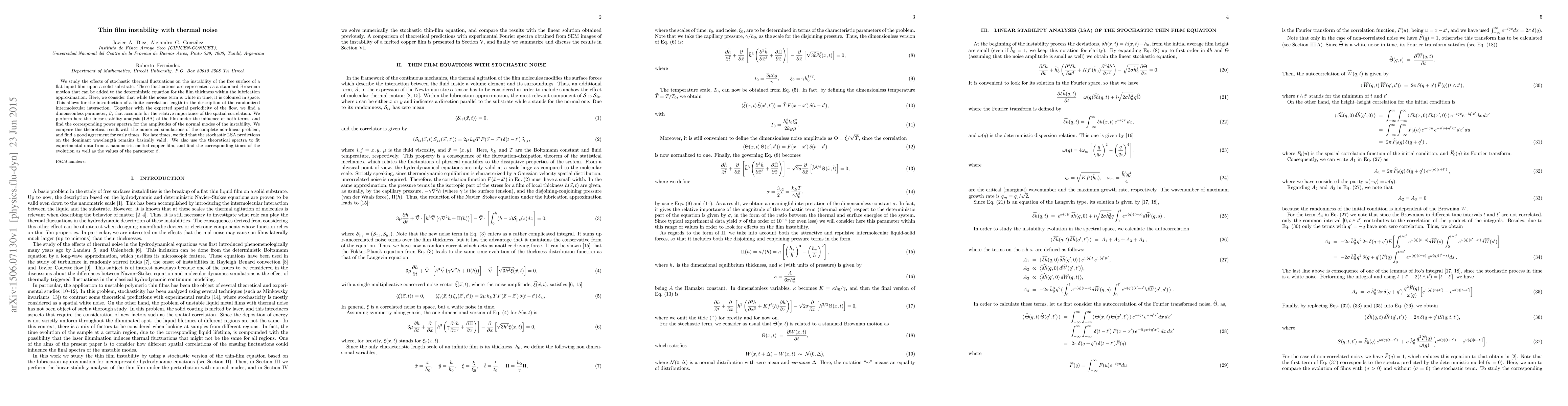 This paper investigates how thermal noise affects the instability of a liquid film's surface on a solid substrate, introducing a spatial correlation length to the noise term. The linear stability analysis and numerical simulations show good agreement for early times, and the theoretical power spectra fit experimental data from a melted copper film, determining the evolution times and the parameter $\beta$.