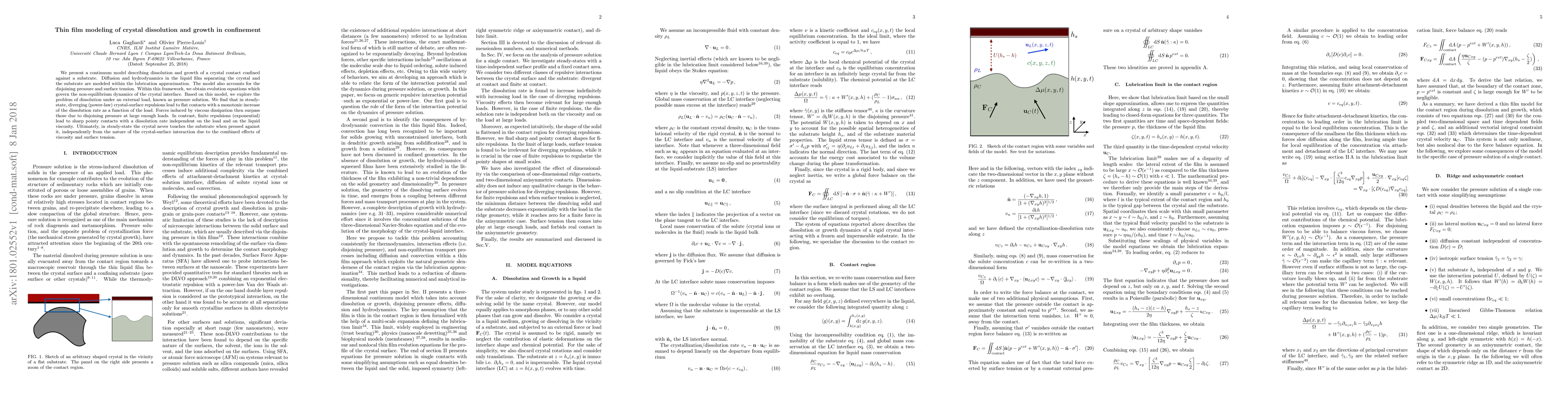 We present a continuum model describing dissolution and growth of a crystal contact confined against a substrate. Diffusion and hydrodynamics in the liquid film separating the crystal and the substrate are modeled within the lubrication approximation. The model also accounts for the disjoining pressure and surface tension. Within this framework, we obtain evolution equations which govern the non-equilibrium dynamics of the crystal interface. Based on this model, we explore the problem of dissolution under an external load, known as pressure solution. We find that in steady-state, diverging (power-law) crystal-surface repulsions lead to flat contacts with a monotonic increase of the dissolution rate as a function of the load. Forces induced by viscous dissipation then surpass those due to disjoining pressure at large enough loads. In contrast, finite repulsions (exponential) lead to sharp pointy contacts with a dissolution rate independent on the load and on the liquid viscosity. Ultimately, in steady-state the crystal never touches the substrate when pressed against it, independently from the nature of the crystal-surface interaction due to the combined effects of viscosity and surface tension.