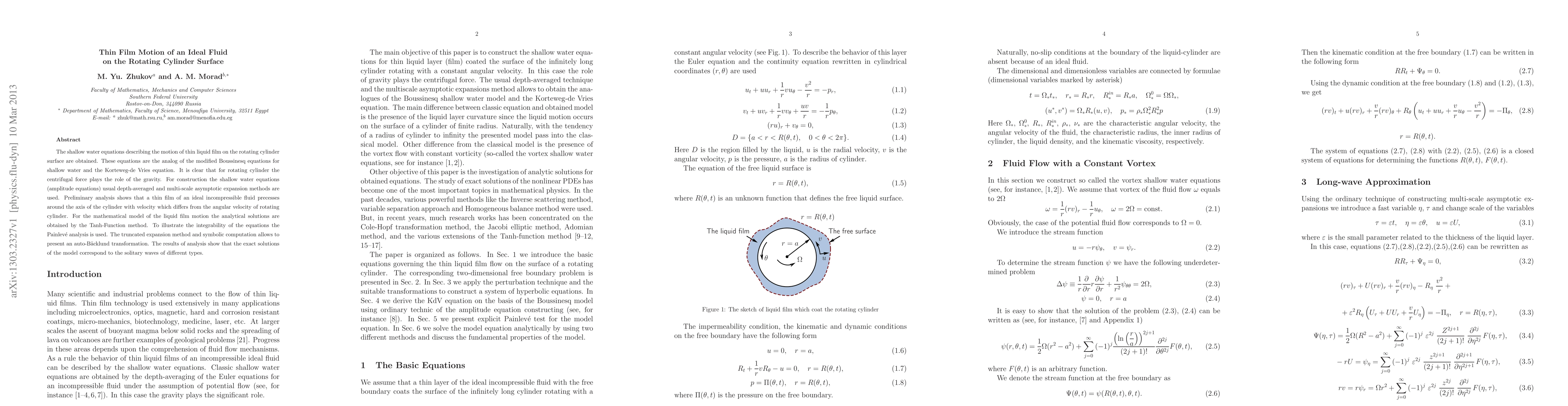 The shallow water equations describing the motion of thin liquid film on the rotating cylinder surface are obtained. These equations are the analog of the modified Boussinesq equations for shallow water and the Korteweg-de Vries equation. It is clear that for rotating cylinder the centrifugal force plays the role of the gravity. For construction the shallow water equations (amplitude equations) usual depth-averaged and multi-scale asymptotic expansion methods are used. Preliminary analysis shows that a thin film of an ideal incompressible fluid precesses around the axis of the cylinder with velocity which differs from the angular velocity of rotating cylinder. For the mathematical model of the liquid film motion the analytical solutions are obtained by the Tanh-Function method. To illustrate the integrability of the equations the Painleve analysis is used. The truncated expansion method and symbolic computation allows to present an auto-Backlund transformation. The results of analysis show that the exact solutions of the model correspond to the solitary waves of different types.