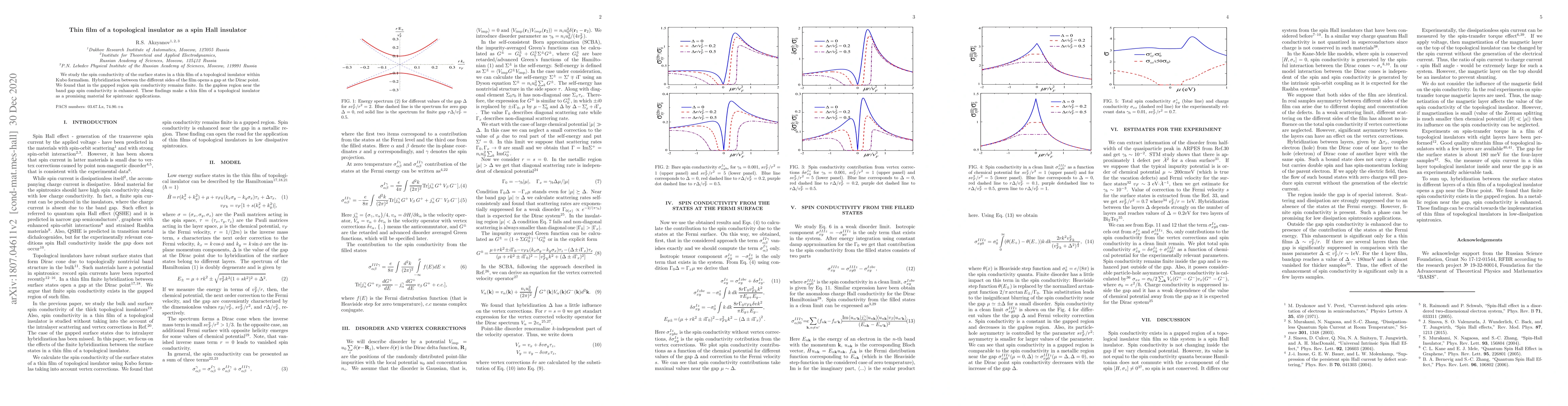 This paper investigates the spin conductivity of a thin film topological insulator, revealing that the surface states maintain finite spin conductivity even after hybridization-induced gap opening, with enhanced spin conductivity near the band gap, suggesting its potential for spintronic applications.