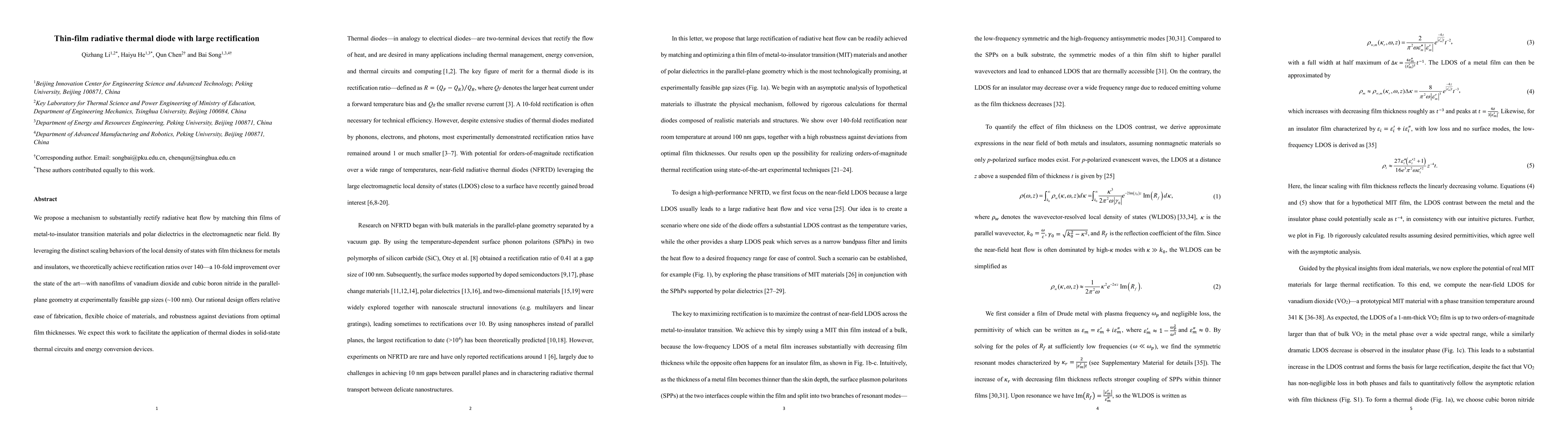 This paper proposes a thin-film radiative thermal diode using materials like vanadium dioxide and cubic boron nitride to achieve significant rectification of heat flow. The design leverages distinct material properties to achieve a 10-fold improvement in rectification ratios over current technologies, offering ease of fabrication and material flexibility.