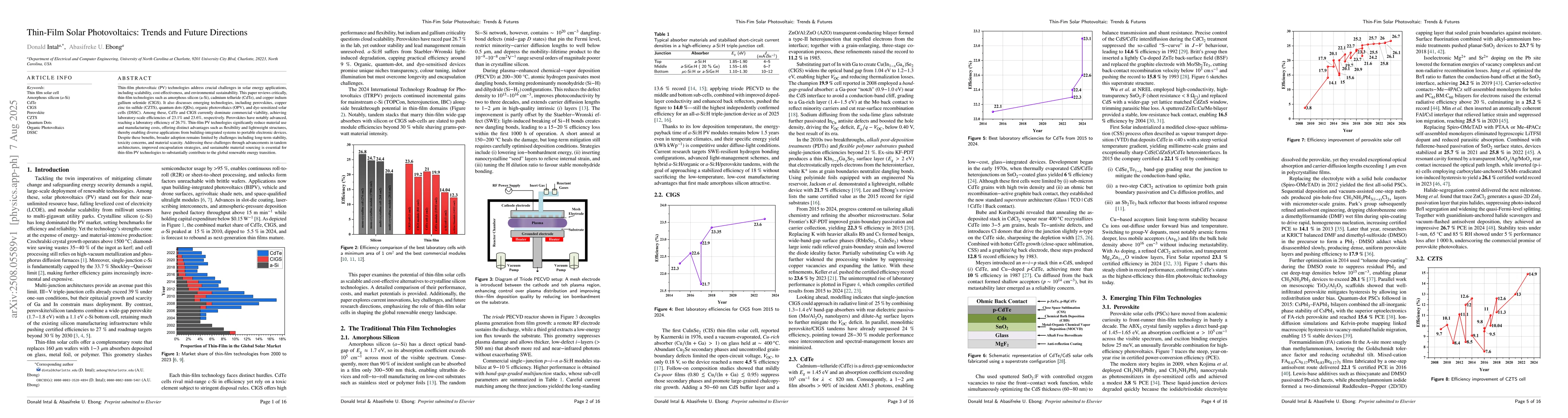 Thin-film photovoltaic (PV) technologies address crucial challenges in solar energy applications, including scalability, cost-effectiveness, and environmental sustainability. This paper reviews critically, thin-film technologies such as amorphous silicon (a-Si), cadmium telluride (CdTe), and copper indium gallium selenide (CIGS). It also discusses emerging technologies, including perovskites, copper zinc tin sulfide (CZTS), quantum dots (QDs), organic photovoltaics (OPV), and dye-sensitized solar cells (DSSC). Among these, CdTe and CIGS currently dominate commercial viability, achieving laboratory-scale efficiencies of 23.1% and 23.6%, respectively. Perovskites have notably advanced, reaching a laboratory efficiency of 26.7%. Thin-film PV technologies significantly reduce material use and manufacturing costs, offering distinct advantages such as flexibility and lightweight structures, thereby enabling diverse applications from building-integrated systems to portable electronic devices. Despite these benefits, broader adoption remains limited by challenges including long-term stability, toxicity concerns, and material scarcity. Addressing these challenges through advancements in tandem architectures, improved encapsulation strategies, and sustainable material sourcing is essential for thin-film PV technologies to substantially contribute to the global renewable energy transition.