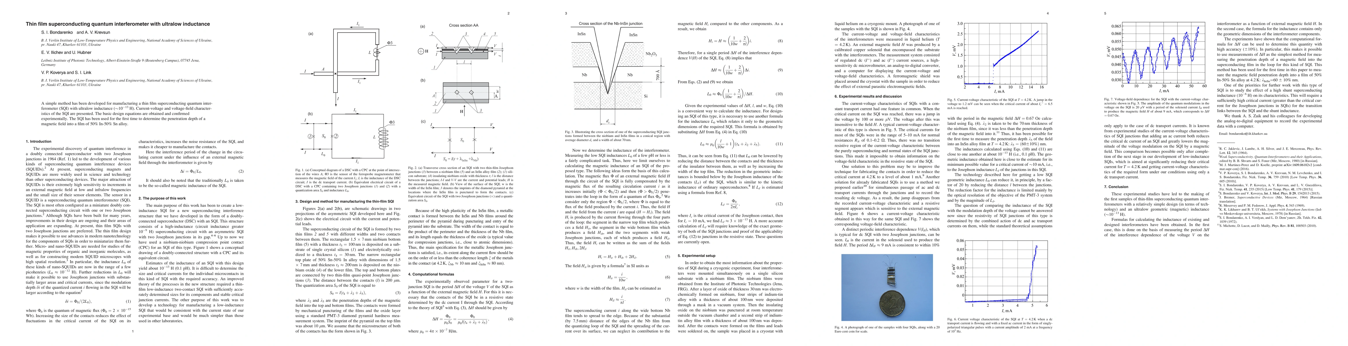 This paper presents a novel method for creating thin film superconducting quantum interferometers (SQIs) with ultralow inductance, demonstrating their application in measuring the magnetic field penetration depth in an In-50% Sn alloy film. Experimental validation of the design equations confirms the interferometer's effectiveness.
