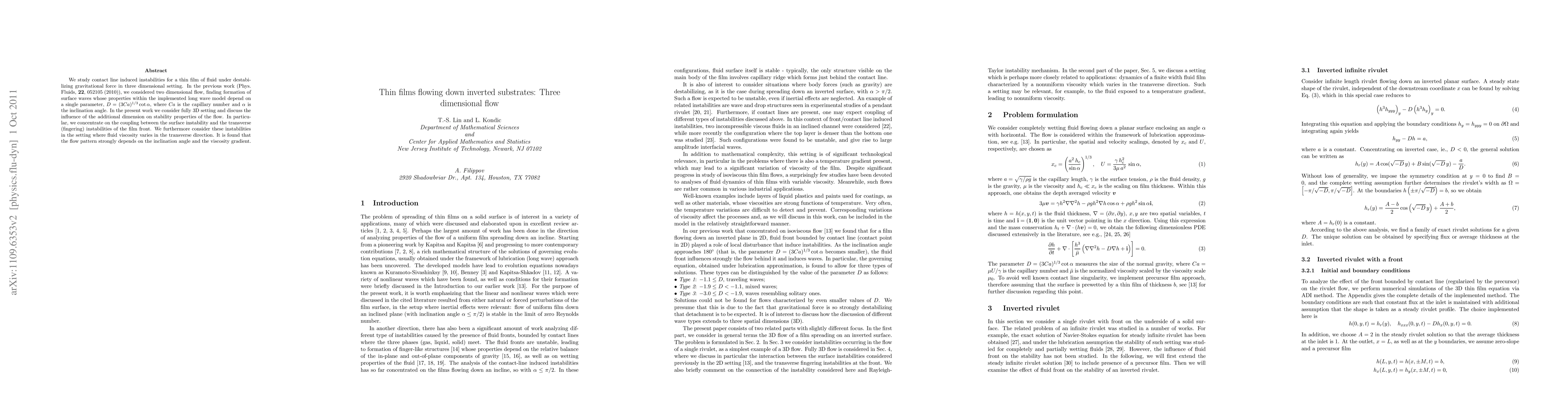 This paper investigates contact line induced instabilities in a three-dimensional thin film flowing down an inverted substrate under gravitational force, focusing on the coupling between surface and transverse instabilities. The study reveals that flow patterns are significantly influenced by the inclination angle and variations in fluid viscosity across the film's transverse direction.