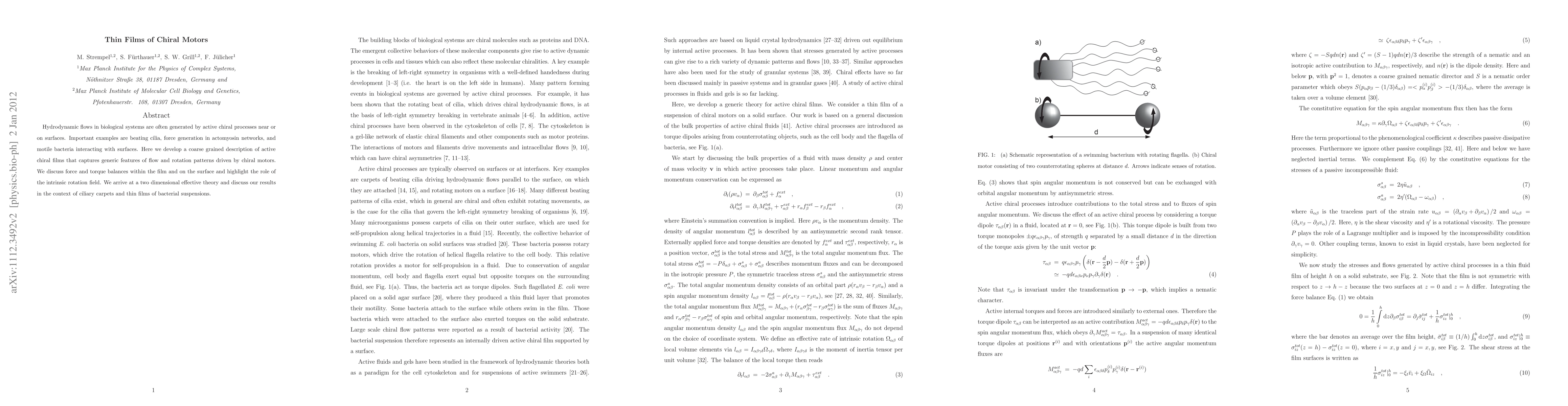 This paper develops a coarse-grained model for active chiral films, capturing flow and rotation patterns driven by chiral motors, and discusses force and torque balances within the film and on surfaces, leading to a two-dimensional effective theory applicable to ciliary carpets and bacterial suspensions.
