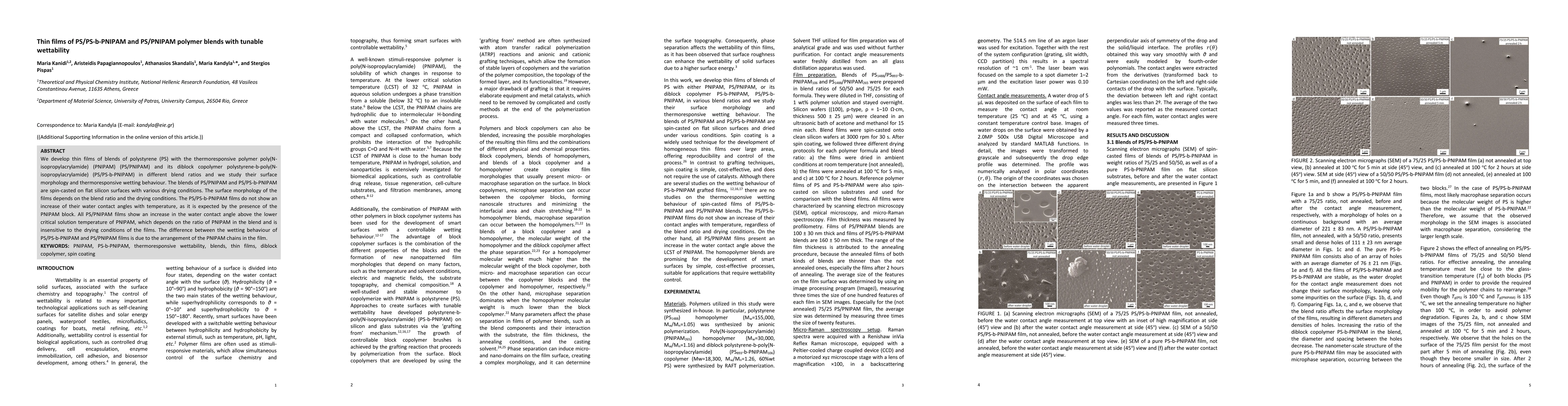 Thin films of PS/PNIPAM and PS/PS-b-PNIPAM blends were developed via spin coating on silicon substrates, and their surface morphology and wetting behavior were studied with varying blend ratios and drying conditions.