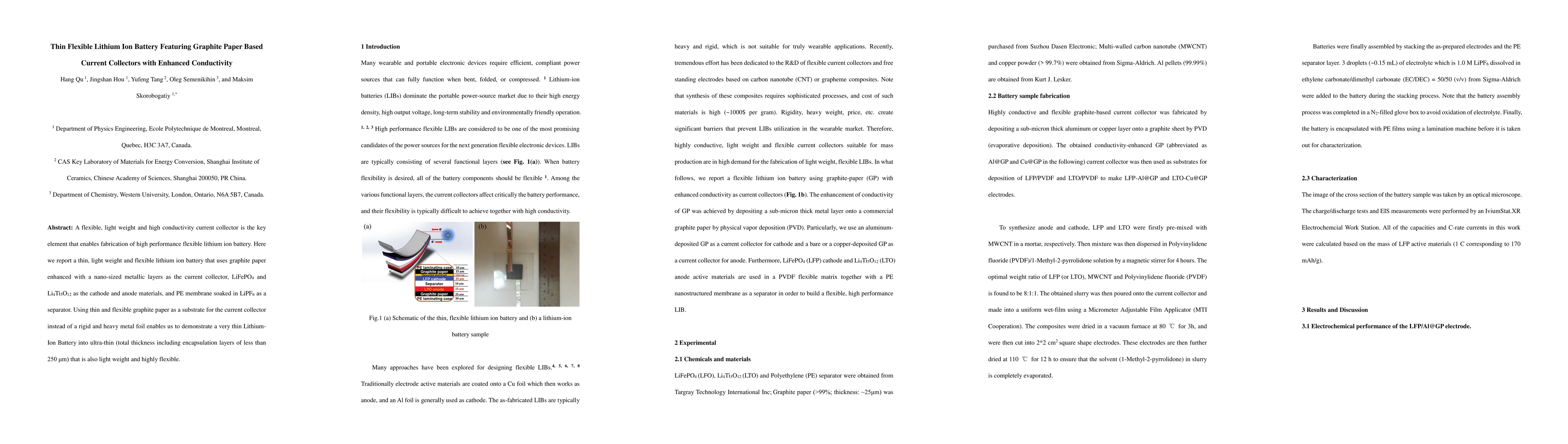 This research presents a thin, lightweight, and flexible lithium-ion battery utilizing graphite paper with enhanced conductivity as the current collector, paired with LiFePO4 and Li4Ti5O12 for the cathode and anode, respectively. The use of flexible graphite paper allows for the creation of an ultra-thin battery (less than 250 μm) that maintains high performance and flexibility.
