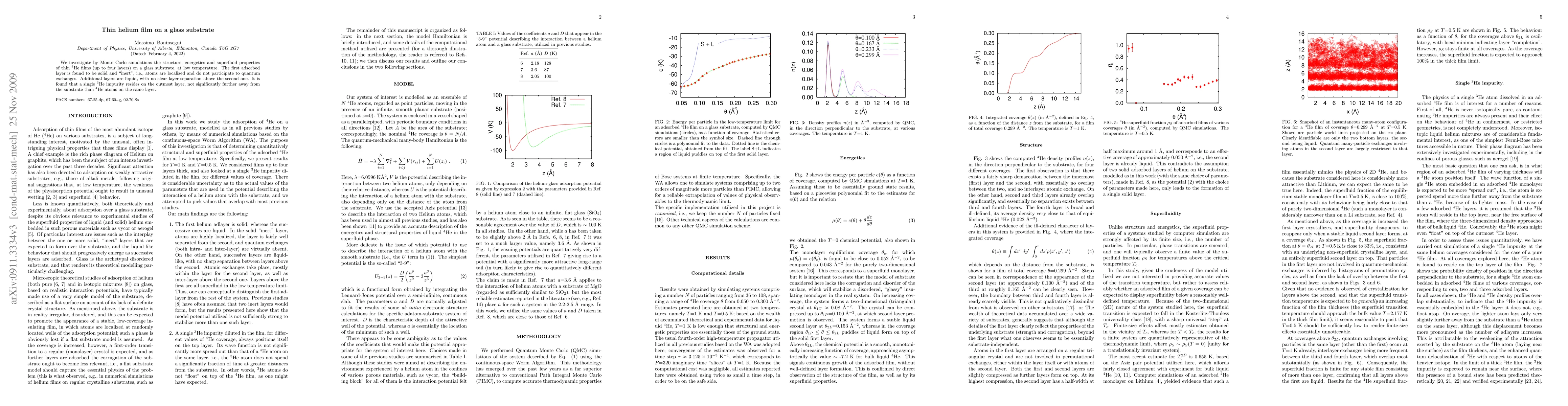 Monte Carlo simulations reveal that thin helium-four films on glass substrates, at low temperatures, exhibit a solid first adsorbed layer with localized atoms, while subsequent layers transition to liquid, losing distinct separation after the second layer. A single helium-three impurity in the outermost layer shows similar positioning to helium-four atoms.