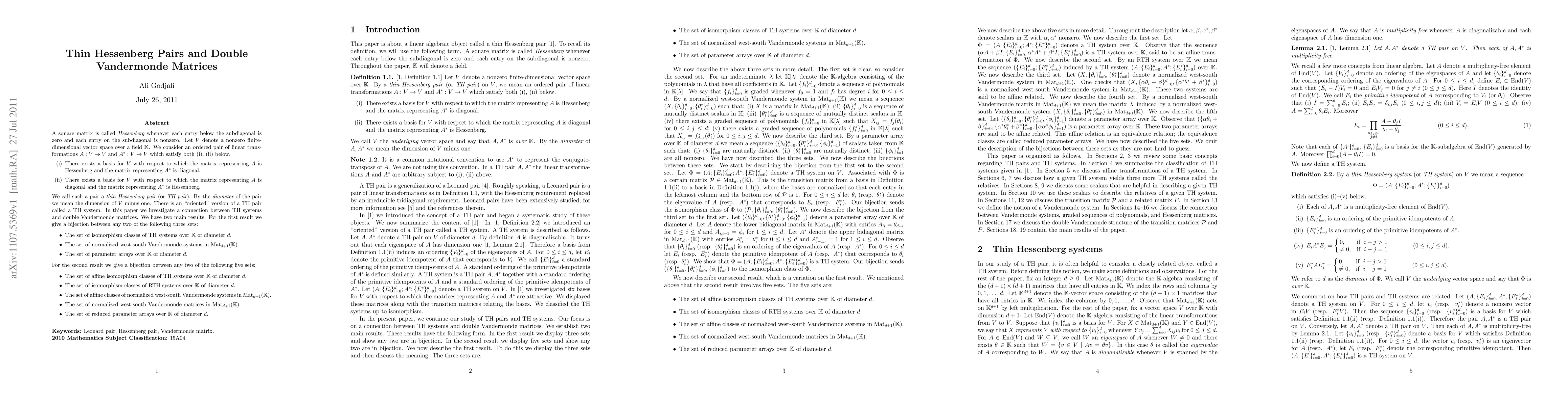A square matrix is called {\it Hessenberg} whenever each entry below the subdiagonal is zero and each entry on the subdiagonal is nonzero. Let $V$ denote a nonzero finite-dimensional vector space over a field $\fld$. We consider an ordered pair of linear transformations $A: V \rightarrow V$ and $A^*: V \rightarrow V$ which satisfy both (i), (ii) below. (i) There exists a basis for $V$ with respect to which the matrix representing $A$ is Hessenberg and the matrix representing $A^*$ is diagonal. (ii) There exists a basis for $V$ with respect to which the matrix representing $A$ is diagonal and the matrix representing $A^*$ is Hessenberg. \noindent We call such a pair a {\it thin Hessenberg pair} (or {\it TH pair}). By the {\it diameter} of the pair we mean the dimension of $V$ minus one. There is an "oriented" version of a TH pair called a TH system. In this paper we investigate a connection between TH systems and double Vandermonde matrices. We give a bijection between any two of the following three sets: \cdot The set of isomorphism classes of TH systems over $\K$ of diameter $d$. \cdot The set of normalized west-south Vandermonde systems in $\Mdf$. \cdot The set of parameter arrays over $\K$ of diameter $d$. We give a bijection between any two of the following five sets: \cdot The set of affine isomorphism classes of TH systems over $\K$ of diameter $d$. \cdot The set of isomorphism classes of RTH systems over $\K$ of diameter $d$. \cdot The set of affine classes of normalized west-south Vandermonde systems in $\Mdf$. \cdot The set of normalized west-south Vandermonde matrices in $\Mdf$. \cdot The set of reduced parameter arrays over $\K$ of diameter $d$.