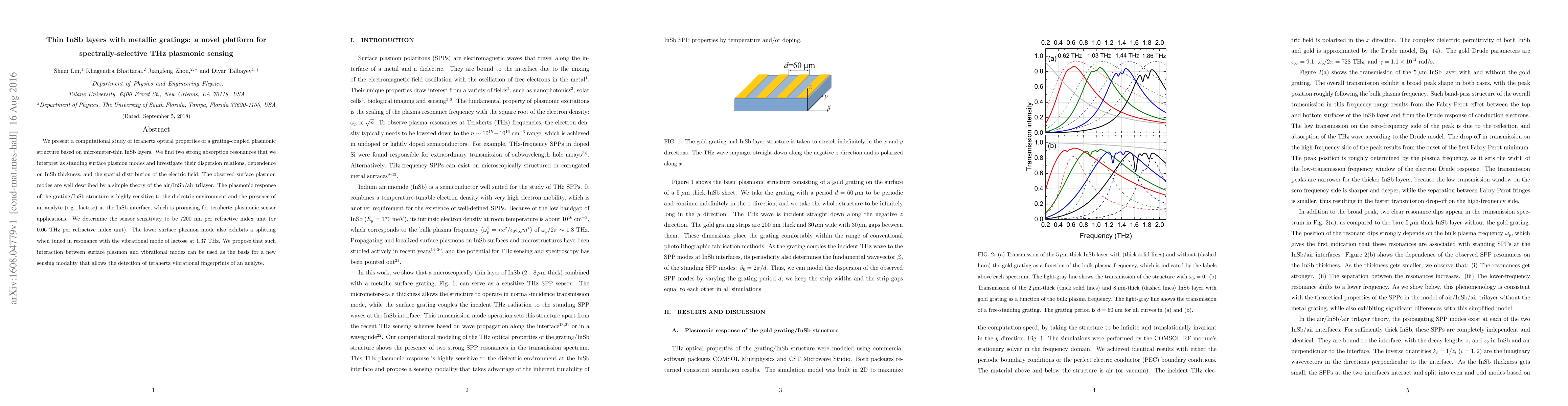 This paper investigates the terahertz optical properties of thin InSb layers with metallic gratings, revealing strong absorption resonances interpreted as standing surface plasmon modes. The study finds high sensitivity to dielectric environments and analytes, suggesting potential for advanced terahertz plasmonic sensing applications.