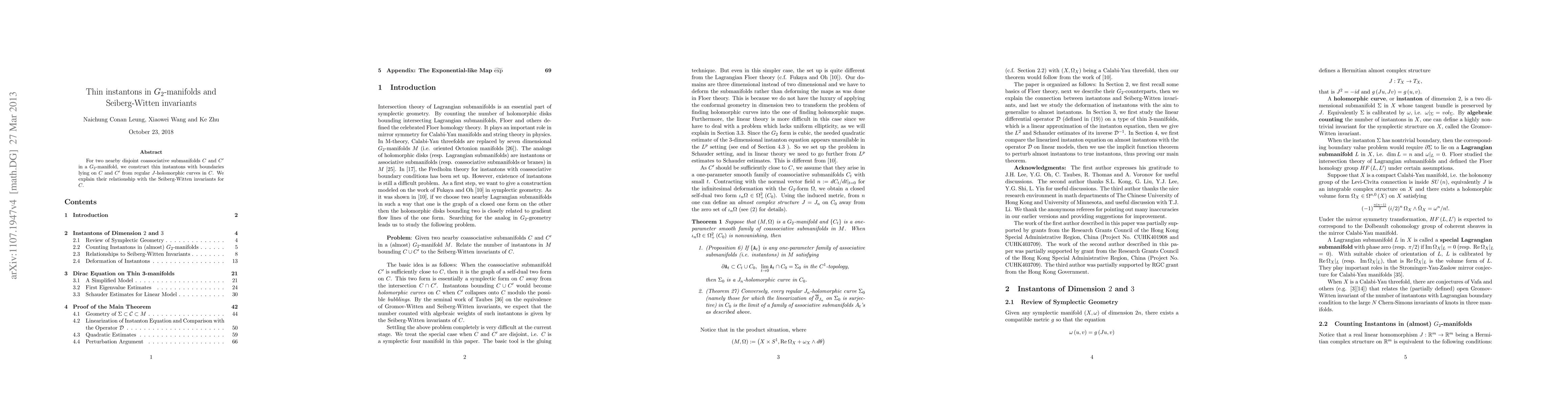 For two nearby disjoint coassociative submanifolds C and C' in a G_2-manifold, we construct thin instantons with boundaries lying on C and C' from regular J-holomorphic curves in C. We explain their relationship with the Seiberg-Witten invariants for C.