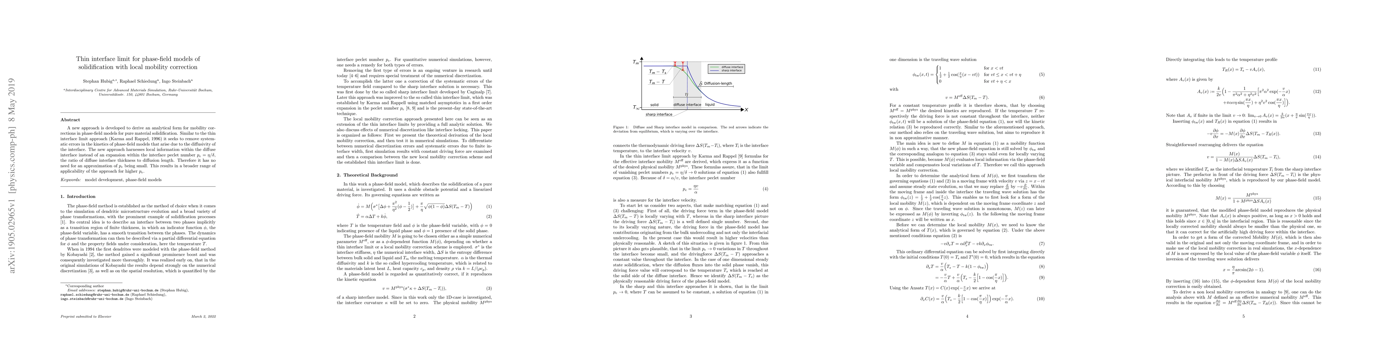 A new approach is developed to derive an analytical form for mobility corrections in phase-field models for pure material solidification. Similar to the thin interface limit approach (Karma and Rappel, 1996) it seeks to remove systematic errors in the kinetics of phase-field models that arise due to the diffusivity of the interface. The new approach harnesses local information within the diffuse interface instead of an expansion within the interface peclet number $p_e=\eta/\delta$, the ratio of diffuse interface thickness to diffusion length. Therefore it has no need for an approximation of $p_e$ being small. This results in a broader range of applicability of the approach for higher $p_e$.