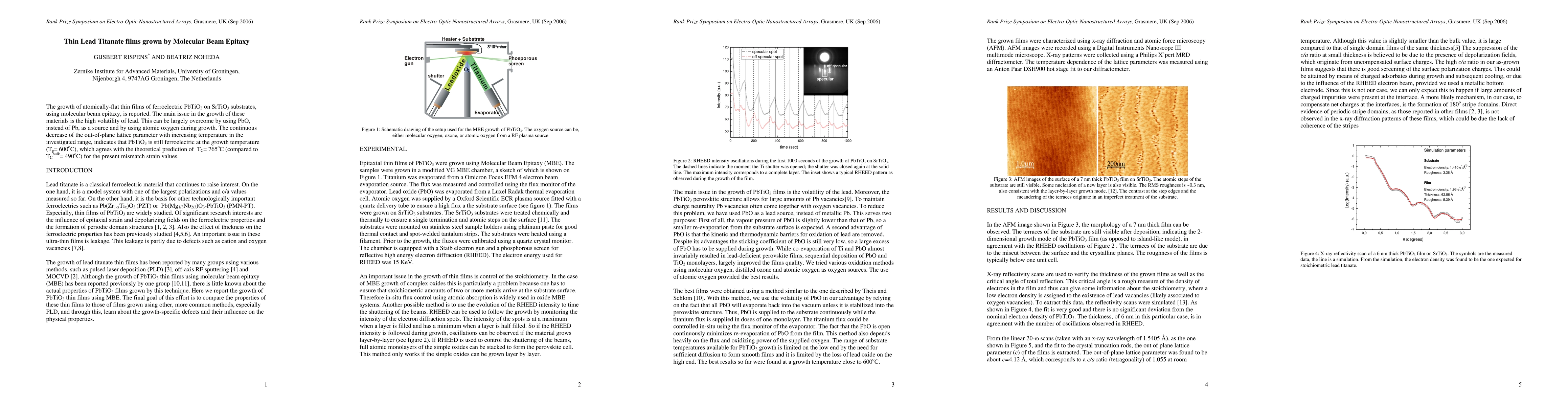 This study reports the successful growth of atomically-flat thin PbTiO3 films on SrTiO3 substrates via molecular beam epitaxy, overcoming lead volatility using PbO and atomic oxygen. The films maintain ferroelectricity at growth temperatures, indicating a Curie temperature shift consistent with theoretical predictions.