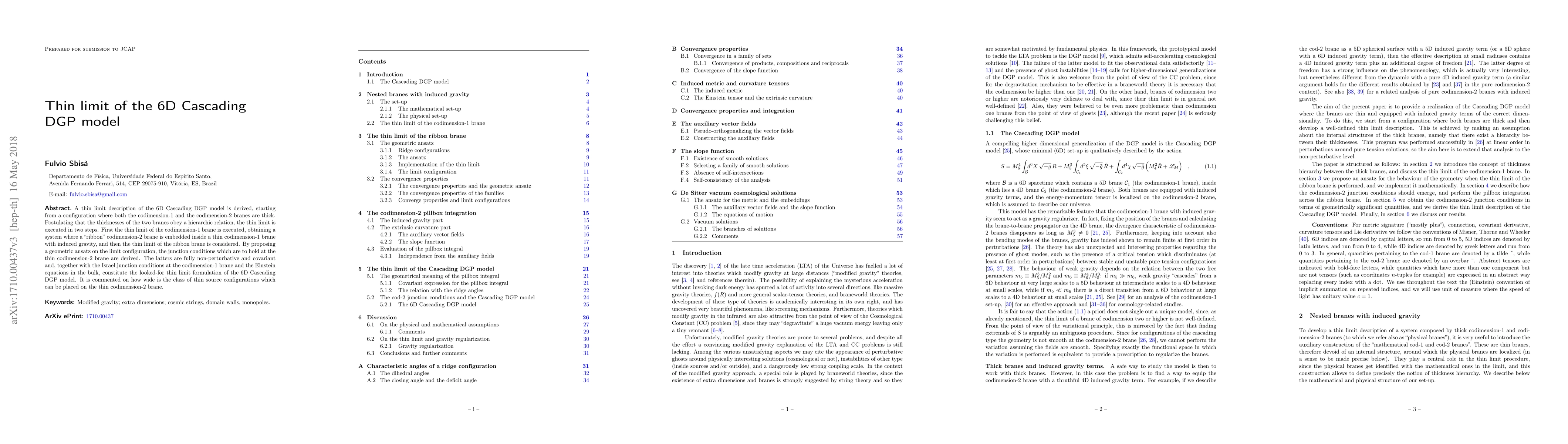 A thin limit description of the 6D Cascading DGP model is derived, starting from a configuration where both the codimension-1 and the codimension-2 branes are thick. Postulating that the thicknesses of the two branes obey a hierarchic relation, the thin limit is executed in two steps. First the thin limit of the codimension-1 brane is executed, obtaining a system where a "ribbon" codimension-2 brane is embedded inside a thin codimension-1 brane with induced gravity, and then the thin limit of the ribbon brane is considered. By proposing a geometric ansatz on the limit configuration, the junction conditions which are to hold at the thin codimension-2 brane are derived. The latters are fully non-perturbative and covariant and, together with the Israel junction conditions at the codimension-1 brane and the Einstein equations in the bulk, constitute the looked-for thin limit formulation of the 6D Cascading DGP model. It is commented on how wide is the class of thin source configurations which can be placed on the thin codimension-2 brane.
