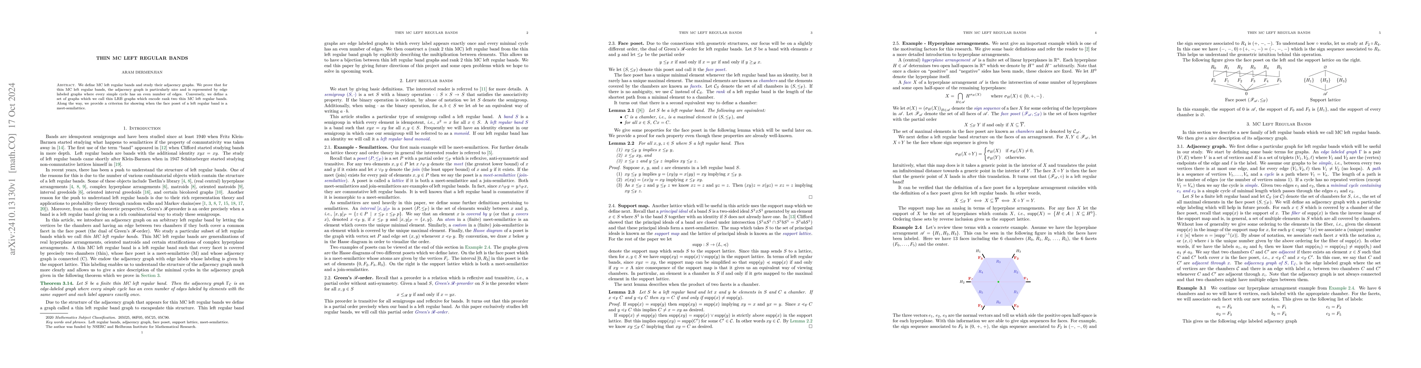 Summary: This paper defines thin MC left regular bands and investigates their adjacency graphs, proving they are structured by edge-labeled graphs with even-length simple cycles. It also introduces thin LRB graphs that represent rank two thin MC left regular bands and provides a criterion for left regular bands' face posets to be meet-semilattices.