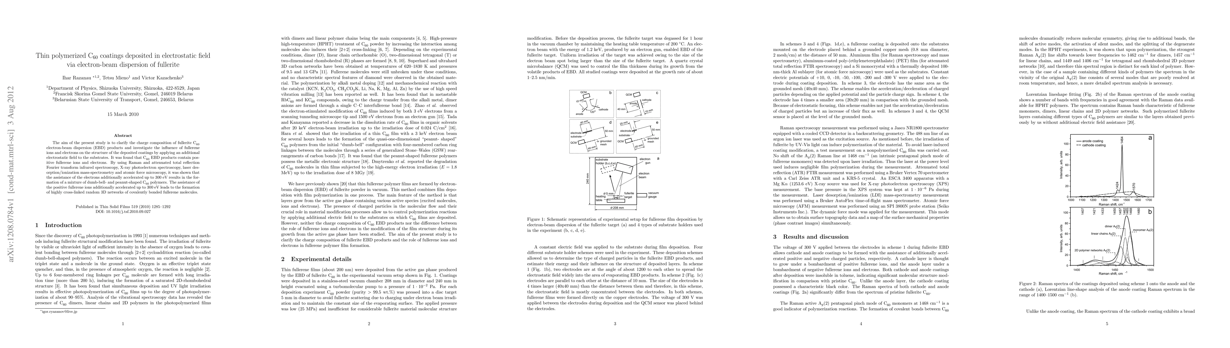 The aim of the present study is to clarify the charge composition of fullerite C60 electron-beam dispersion (EBD) products and investigate the influence of fullerene ions and electrons on the structure of the deposited coatings by applying an additional electrostatic field to the substrates. It was found that C60 EBD products contain positive fullerene ions and electrons. By using Raman and attenuated total reflection Fourier transform infrared spectroscopy, X-ray photoelectron spectroscopy, laser desorption/ionization mass-spectrometry and atomic force microscopy, it was shown that the assistance of the electrons additionally accelerated up to 300 eV results in the formation of a mixture of dumb-bell- and peanut-shaped C60 polymers. The assistance of the positive fullerene ions additionally accelerated up to 300 eV leads to the formation of highly cross-linked random 3D networks of covalently bonded fullerene molecules.