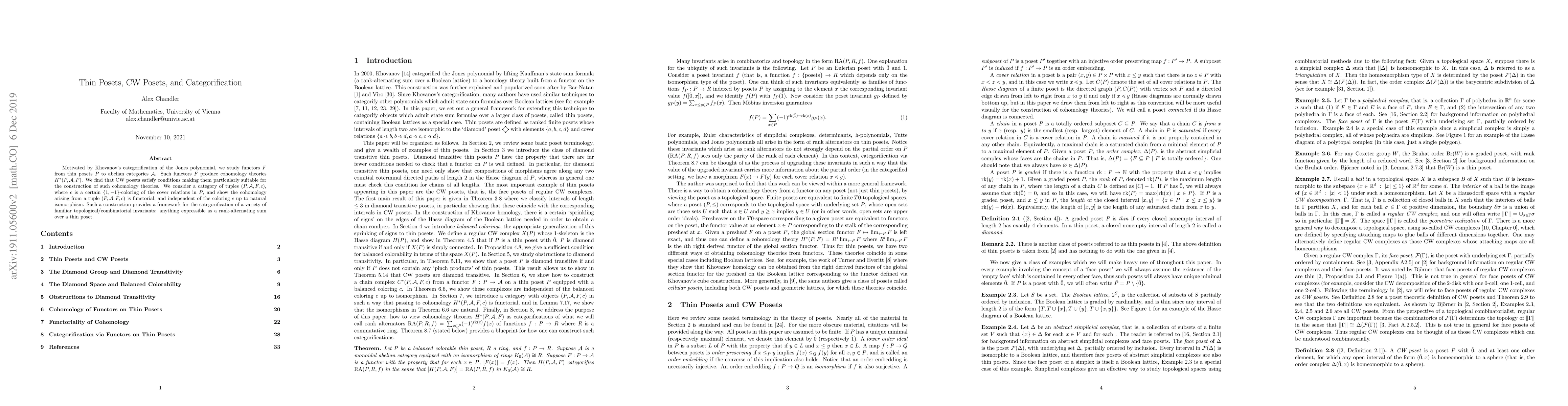 This paper generalizes Khovanov's categorification of the Jones polynomial by studying cohomology theories derived from functors on thin posets, identifying CW posets as ideal structures for these theories. It establishes a framework for categorifying rank-alternating sums over thin posets.