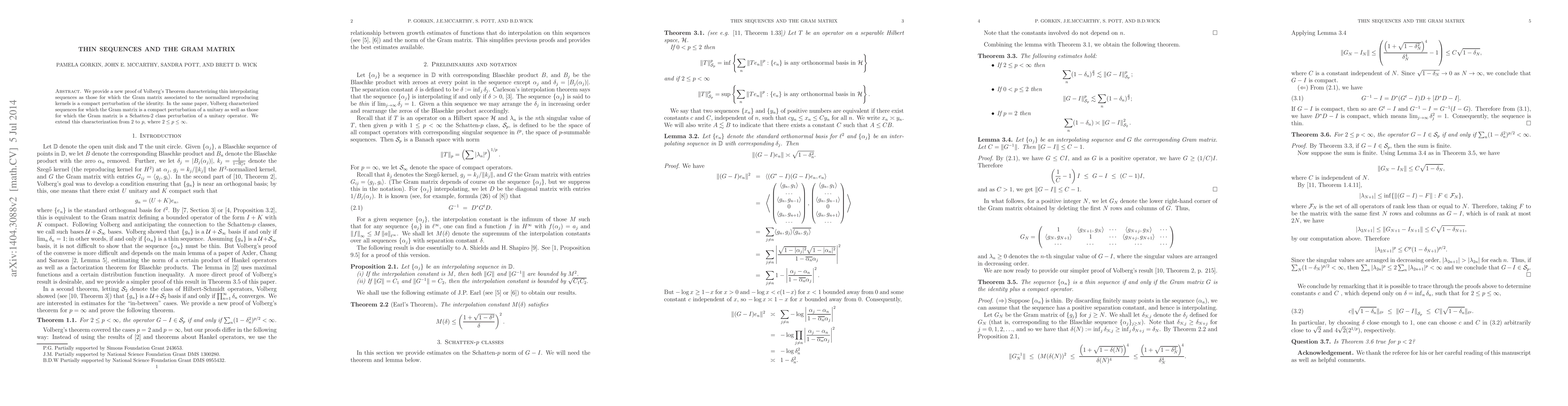 We provide a new proof of Volberg's Theorem characterizing thin interpolating sequences as those for which the Gram matrix associated to the normalized reproducing kernels is a compact perturbation of the identity. In the same paper, Volberg characterized sequences for which the Gram matrix is a compact perturbation of a unitary as well as those for which the Gram matrix is a Schatten-$2$ class perturbation of a unitary operator. We extend this characterization from $2$ to $p$, where $2 \le p \le \infty$.