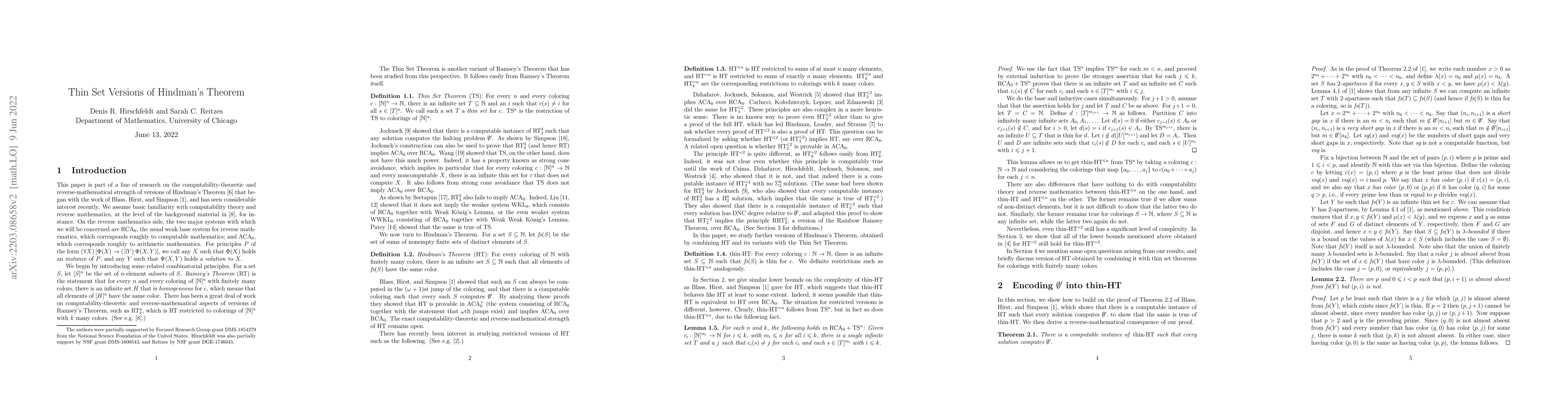 This paper explores the reverse mathematical strength of a modified version of Hindman's Theorem, termed thin-HT, which combines Hindman's Theorem with the Thin Set Theorem. The authors demonstrate that thin-HT implies $ACA_0$ over $RCA_0 + I\Sigma^0_2$, while a computable instance of its restriction to sums of exactly two elements has solutions that are diagonally noncomputable relative to $\emptyset'$, indicating no $\Sigma^0_2$ solutions.