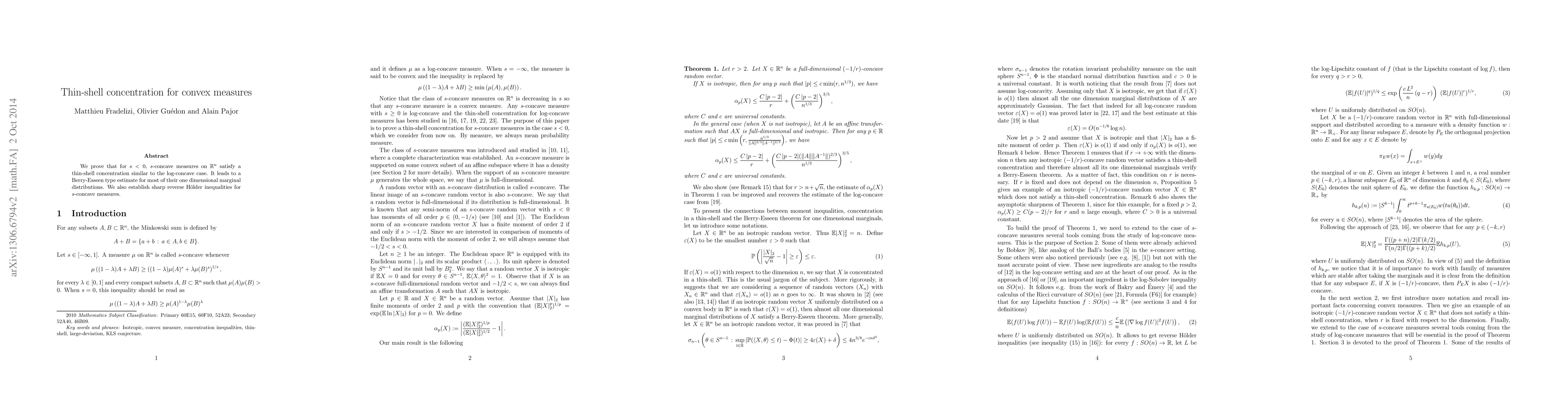 We prove that for $s<0$, $s$-concave measures on ${\mathbb R}^n$ satisfy a thin shell concentration similar to the log-concave one. It leads to a Berry-Esseen type estimate for their one dimensional marginal distributions. We also establish sharp reverse H\"older inequalities for $s$-concave measures.